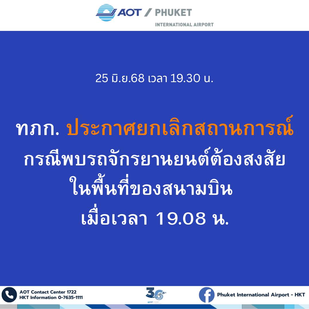 วันที่ 25 มิถุนายน 2568 เวลา 16.10 น. ศูนย์รักษาความปลอดภัยท่าอากาศยานภูเก็ต ได้รับแจ้ง พบรถจักรยานยนต์ต้องสงสัยจำนวน 1 คัน จอดทิ้งไว้บริเวณลานจอดรถจักรยานยนต์ ฝั่งอาคารผู้โดยสารภายในประเทศ ท่าอากาศยานภูเก็ต (ทภก.) โดยก่อนหน้านี้มีรถจักรยานยนต์เข้ามาจอดจำนวน 2 คัน แต่มีการขับออกไปเพียง 1 คัน อีกคันถูกทิ้งไว้โดยไม่มีผู้แสดงตัวเป็นเจ้าของ