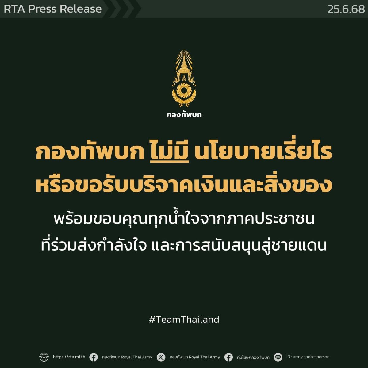 กองทัพบกยืนยัน "ไม่มีนโยบายขอเรี่ยไรหรือขอรับบริจาคเงินและสิ่งของ" พร้อมขอบคุณทุกน้ำใจจากทุกภาคส่วนที่ร่วมส่งกำลังใจ และการสนับสนุนสู่ชายแดน