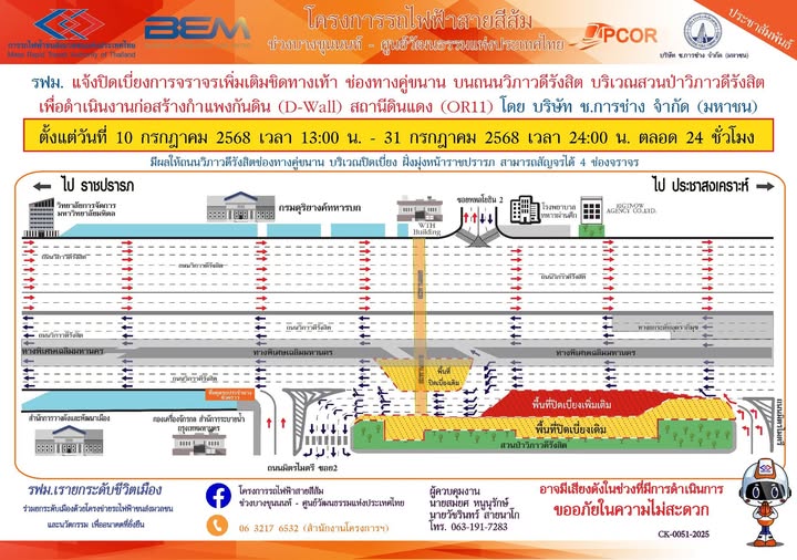รฟม. แจ้งปิดเบี่ยงจราจรเพิ่มเติมชิดทางเท้า ช่องทางคู่ขนาน บนถนนวิภาวดีรังสิต บริเวณสวนป่าวิภาวดีรังสิต เพื่อดำเนินงานก่อสร้างกำแพงกันดิน (D-Wall) สถานีดินแดง (OR11) โครงการรถไฟฟ้าสายสีส้ม ช่วงบางขุนนนท์ – ศูนย์วัฒนธรรมแห่งประเทศไทย ตั้งแต่วันที่ 10 กรกฎาคม 2568 เวลา 13.00 น. – 31 กรกฎาคม 2568 เวลา 24.00 น. ตลอด 24 ชั่วโมง