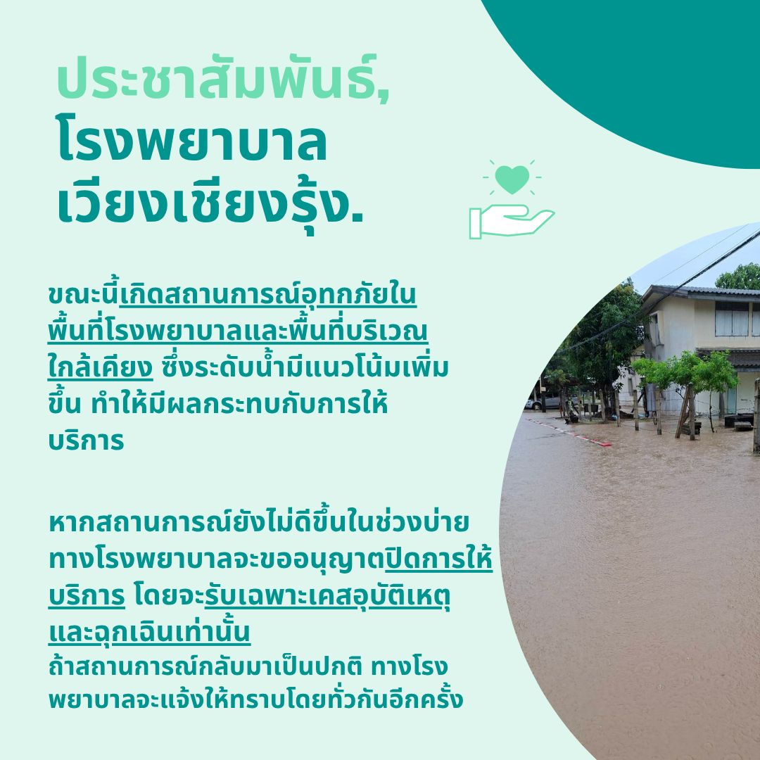 จากการประชาสัมพันธ์ของโรงพยาบาลเวียงเชียงรุ้ง ระบุว่า ขณะนี้ระดับน้ำมีแนวโน้มเพิ่มสูงขึ้นอย่างต่อเนื่อง ซึ่งอาจส่งผลกระทบต่อการให้บริการผู้ป่วยโดยรวม หากสถานการณ์น้ำท่วมยังคงไม่ดีขึ้นในช่วงบ่ายวันนี้ ทางโรงพยาบาลมีความจำเป็นต้อง ขออนุญาตปิดการให้บริการชั่วคราว โดยจะรับเฉพาะกรณีผู้ป่วยอุบัติเหตุและฉุกเฉินเท่านั้น เพื่อความปลอดภัยและประสิทธิภาพในการดูแลผู้ป่วยวิกฤต