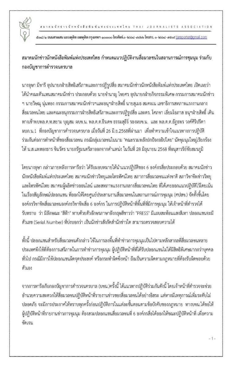 เพื่อทำความเข้าใจแนวทางการปฎิบัติร่วมกันต่อการทำหน้าที่ของสื่อมวลชน กรณีกลุ่มมวลชนในนาม "คณะรวมพลังปกป้องอธิปไตย" นัดชุมนุมใหญ่เรียกร้องให้ น.ส.แพทองธาร ชินวัตร นายกรัฐมนตรีลาออกจากตำแหน่ง ในวันที่ 28 มิถุนายน 2568 ที่อนุสาวรีย์ชัยสมรภูมิ