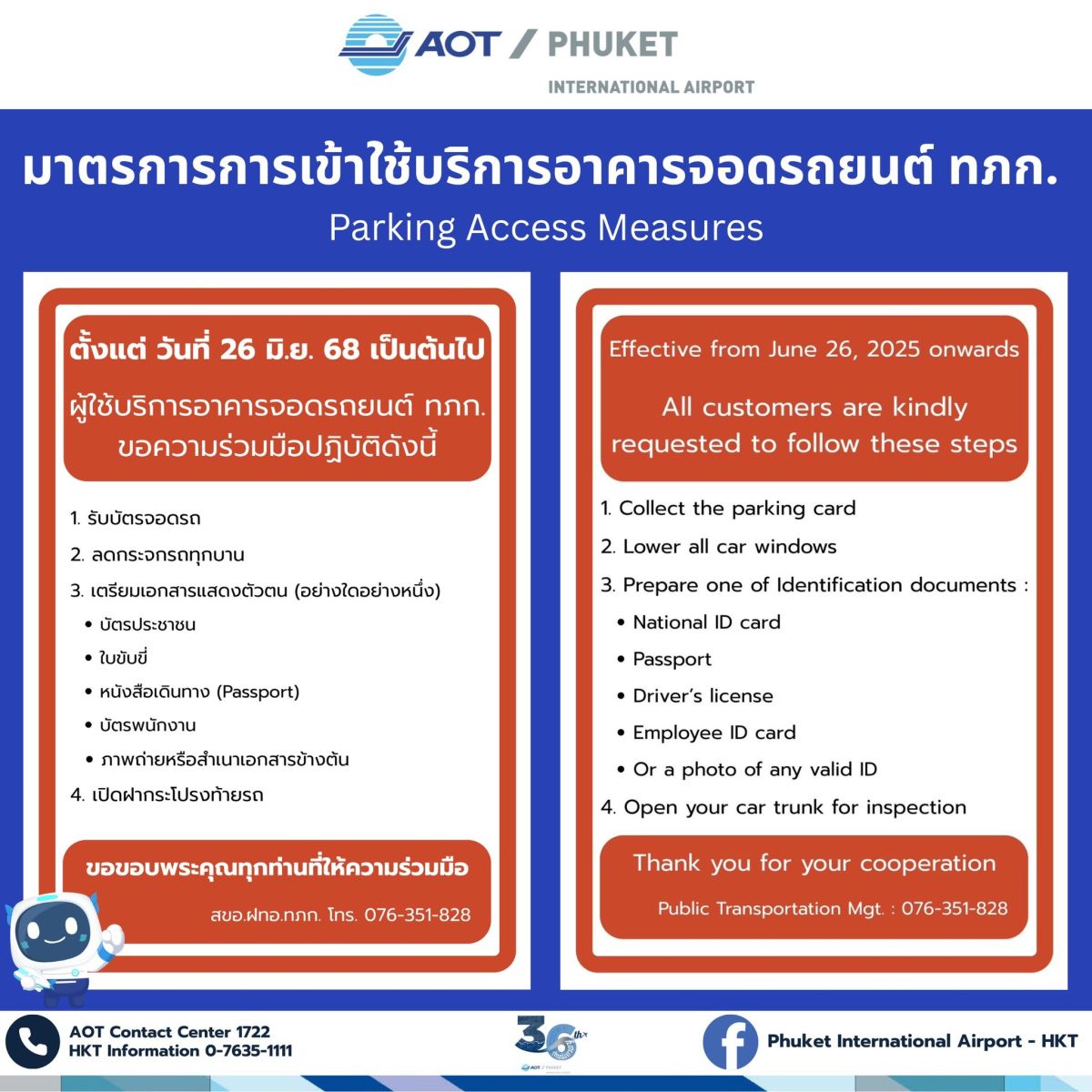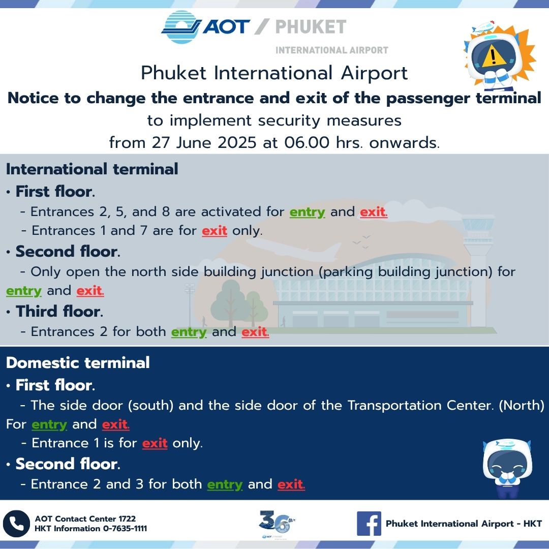 ท่าอากาศยานภูเก็ต (ทภก.) ขอแจ้งปรับเปลี่ยนเส้นทางการเข้า-ออกอาคารผู้โดยสารระหว่างประเทศและอาคารผู้โดยสารภายในประเทศ เพื่อให้เป็นไปตามมาตรการด้านการรักษาความปลอดภัยอย่างเคร่งครัด โดยจะเริ่มดำเนินการตั้งแต่วันที่ 27 มิถุนายน 2568 เวลา 06.00 น.เป็นต้นไป มีรายละเอียดการปรับเปลี่ยนมีดังนี้: