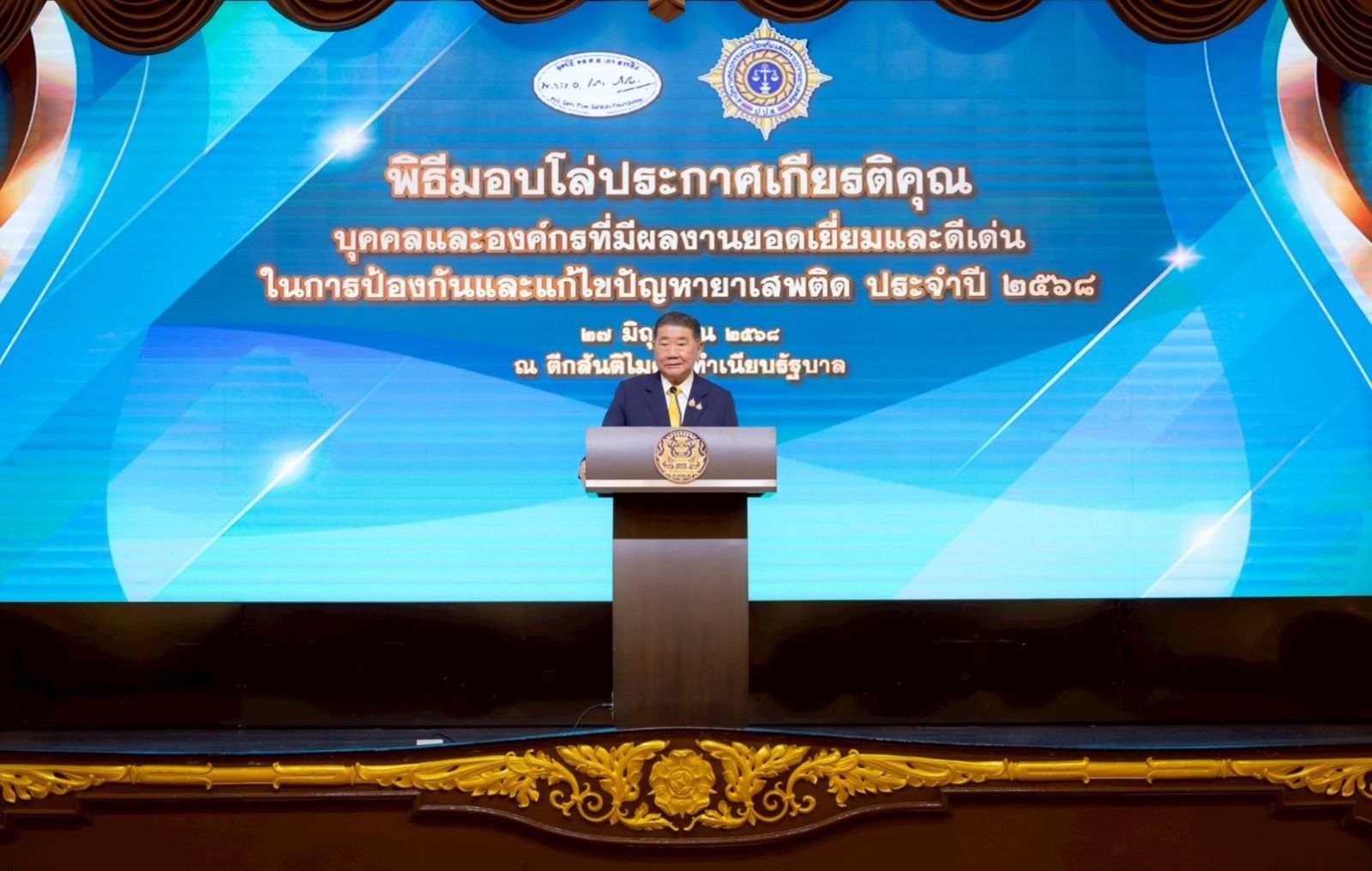 วันที่ 27 มิถุนายน 2568 นายภูมิธรรม เวชยชัย รองนายกรัฐมนตรีและรัฐมนตรีว่าการกระทรวงกลาโหม เป็นประธานในพิธีมอบโล่ประกาศเกียรติคุณบุคคลและองค์กรที่มีผลงานยอดเยี่ยมและดีเด่นในการป้องกันและแก้ไขปัญหายาเสพติด ประจำปี 2568 ณ ตึกสันติไมตรี (หลังนอก) ทำเนียบรัฐบาล โดยมี นายวิชัย ไชยมงคล ที่ปรึกษารัฐมนตรีว่าการกระทรวงสาธารณสุข นายกูเฮง ยาวอหะซัน เลขานุการรัฐมนตรีว่าการกระทรวงยุติธรรม พล.ต.ท.ภาณุรัตน์ หลักบุญ เลขาธิการคณะกรรมการป้องกันและปราบปรามยาเสพติด (เลชาธิการ ป.ป.ส.) นายกลินท์ สารสิน ประธานกรรมการมูลนิธิ พล.ต.อ.เภา สารสิน Mr. Benedikt Hofmann ผู้แทน UNODC แขกผู้มีเกียรติชาวต่างประเทศ (FANC) ผู้ได้รับโล่ประกาศเกียรติคุณฯ ระดับยอดเยี่ยม และดีเด่น และทายาท/ครอบครัวผู้เสียสละชีวิต เข้าร่วมรับโล่ประกาศเกียรติคุณ
