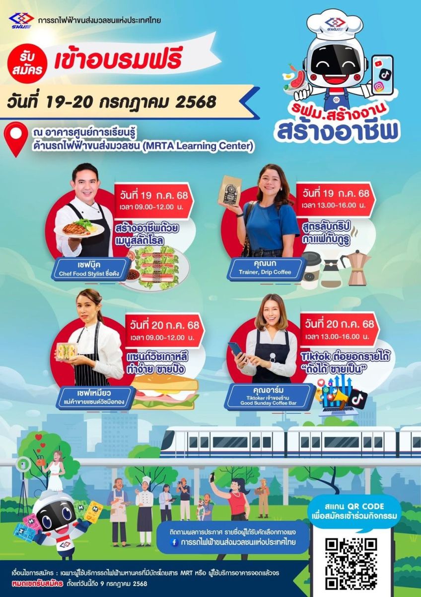 รฟม. ชวนทุกท่าน สร้างงาน เสริมทักษะ เพิ่มรายได้ เวิร์กชอปเรียนรู้อาชีพจากตัวจริง ทั้งเชฟ บาริสต้า และ TikToker ในกิจกรรม “รฟม. สร้างงาน สร้างอาชีพ” วันเสาร์ที่ 19 – วันอาทิตย์ที่ 20 กรกฎาคม 2568 ณ ศูนย์การเรียนรู้การรถไฟฟ้าขนส่งมวลชนแห่งประเทศไทย (MRTA Learning Center)