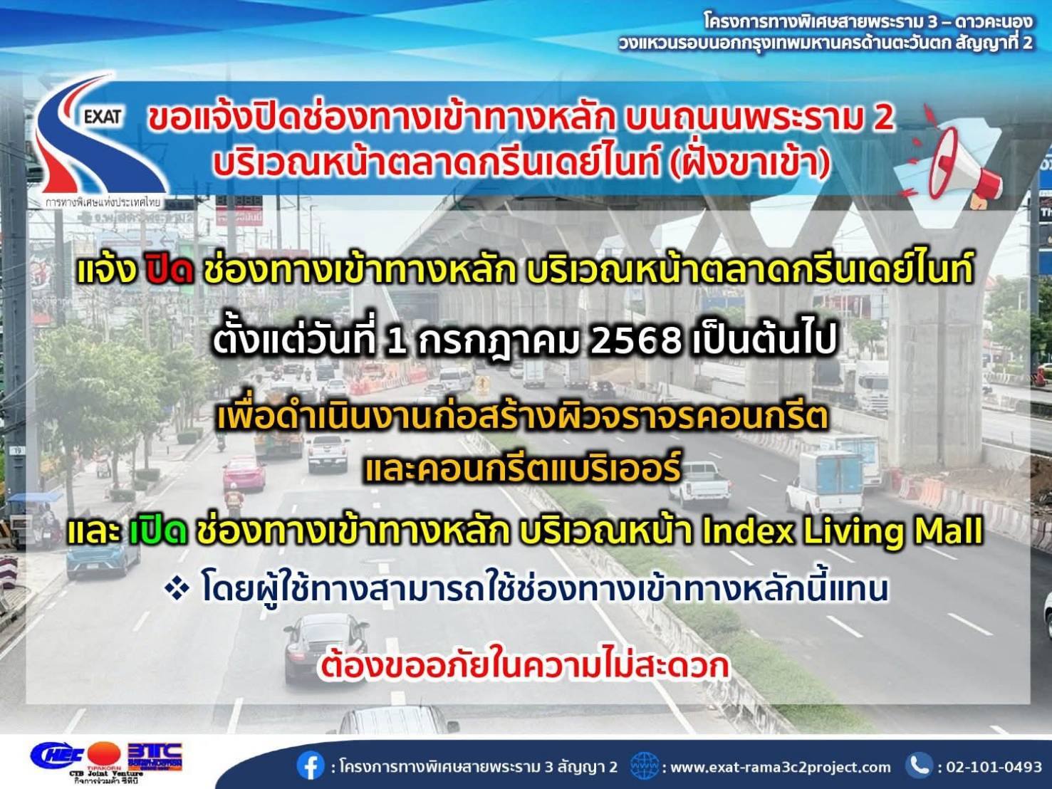 การทางพิเศษแห่งประเทศไทย (กทพ.) กระทรวงคมนาคม จะเข้าดำเนินงานก่อสร้างผิวจราจรคอนกรีต และคอนกรีตแบริเออร์ โครงการทางพิเศษสายพระราม 3-ดาวคะนอง-วงแหวนรอบนอกกรุงเทพมหานครด้านตะวันตก สัญญาที่ 2 จึงมีความจำเป็นจะต้องปิดช่องทางเข้าทางหลัก บนถนนพระราม 2 (ฝั่งขาเข้า) บริเวณหน้าตลาดกรีนเดย์ไนท์ ตั้งแต่วันที่ 1 กรกฎาคม 2568 เป็นต้นไป ตลอด 24 ชั่วโมงจนกว่าจะเสร็จสิ้นโครงการ และได้เปิดช่องทางเข้าทางหลัก บริเวณหน้า Index Living Mall โดยผู้ใช้ทางดังกล่าวสามารถใช้ช่องทางเข้าทางหลักนี้แทน