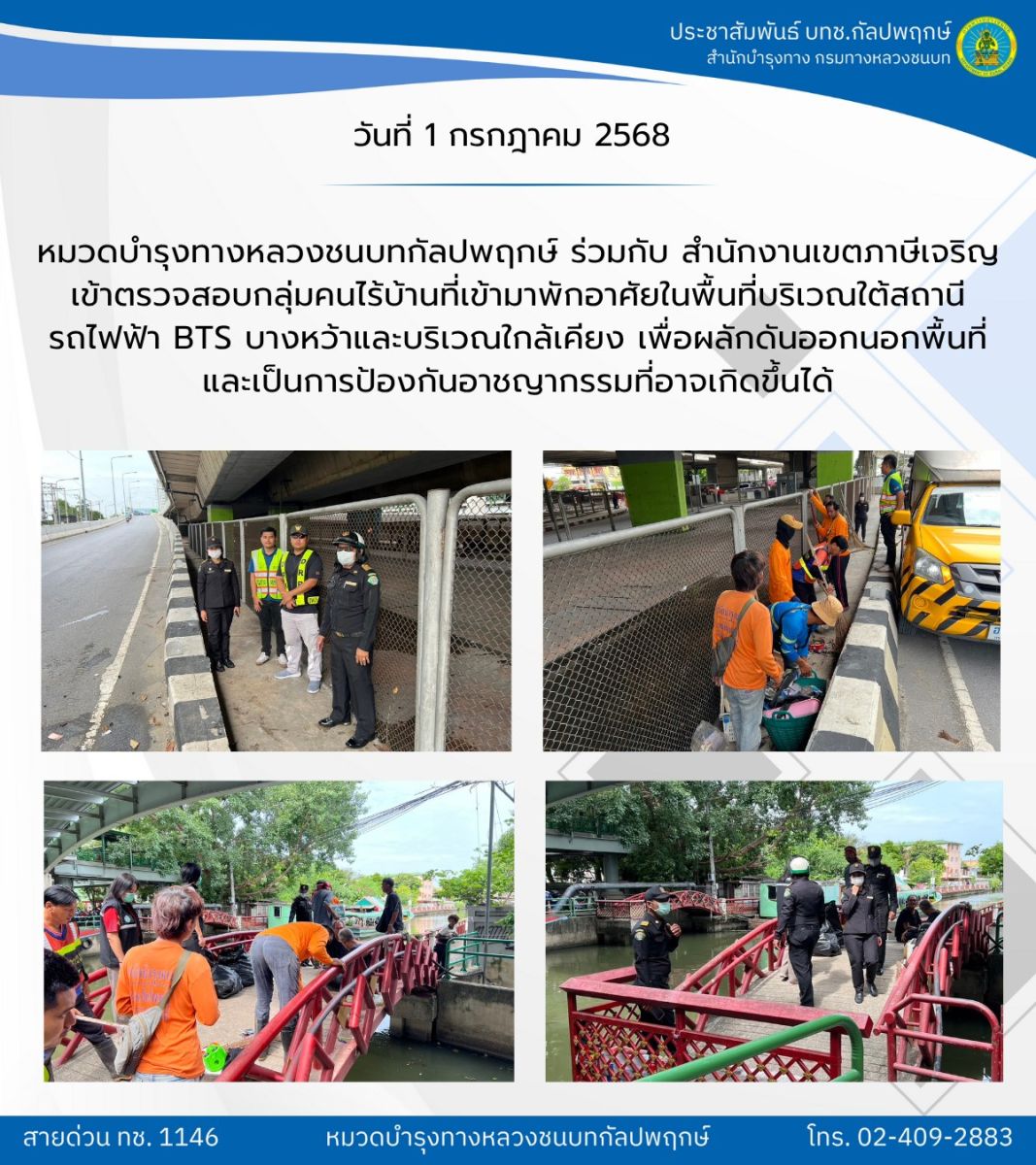 เมื่อวันที่ 1 กรกฎาคม 2568 บทช.กัลปพฤกษ์ ร่วมกับ สำนักงานเขตภาษีเจริญ เข้าตรวจสอบกลุ่มคนไร้บ้านที่เข้ามาพักอาศัยในพื้นที่บริเวณใต้สถานีรถไฟฟ้า BTS บางหว้าและบริเวณใกล้เคียง เพื่อผลักดันออกนอกพื้นที่และเป็นการป้องกันอาชญากรรมที่อาจเกิดขึ้นได้
