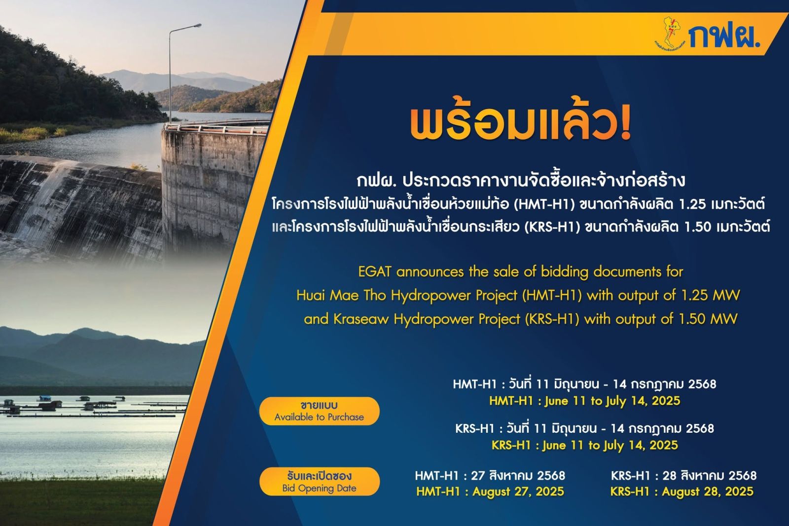 กฟผ. เดินหน้าพัฒนาโรงไฟฟ้าพลังงานสะอาด เปิดขายเอกสารประกวดราคาโรงไฟฟ้าพลังน้ำเขื่อนกระเสียว และโรงไฟฟ้าพลังน้ำเขื่อนห้วยแม่ท้อ ตั้งแต่วันนี้ – 14 ก.ค. 68 เพื่อเปิดโอกาสให้ผู้ประกอบการเข้ามามีส่วนร่วมในการขับเคลื่อนพลังงานสะอาดของประเทศ