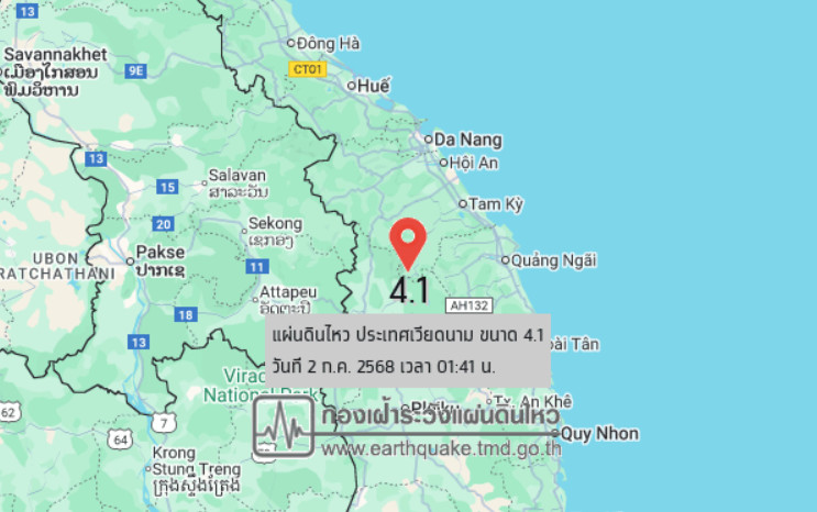 วันที่ 2 กรกฎาคม 2568 เวลา 01.41 น. กองเฝ้าระวังแผ่นดินไหว กรมอุตุนิยมวิทยา แจ้งเหตุแผ่นดินไหว ขนาด 4.1 ความลึก 10 กม. ภายในพื้นที่ของประเทศเวียดนาม ศูนย์กลางห่างออกไปทางทิศตะวันออกเฉียงใต้ของ อ.เมือง จ.อุบลราชธานี ประมาณ 342 กม. ยังไม่มีรายงานผลกระทบต่อประเทศไทย