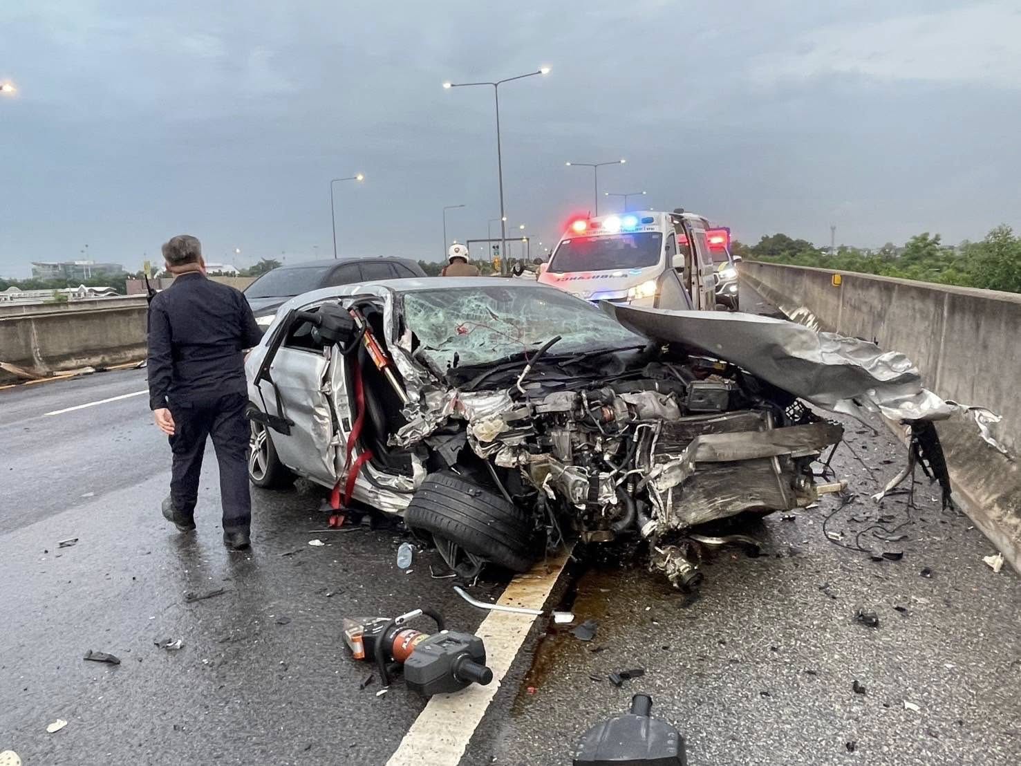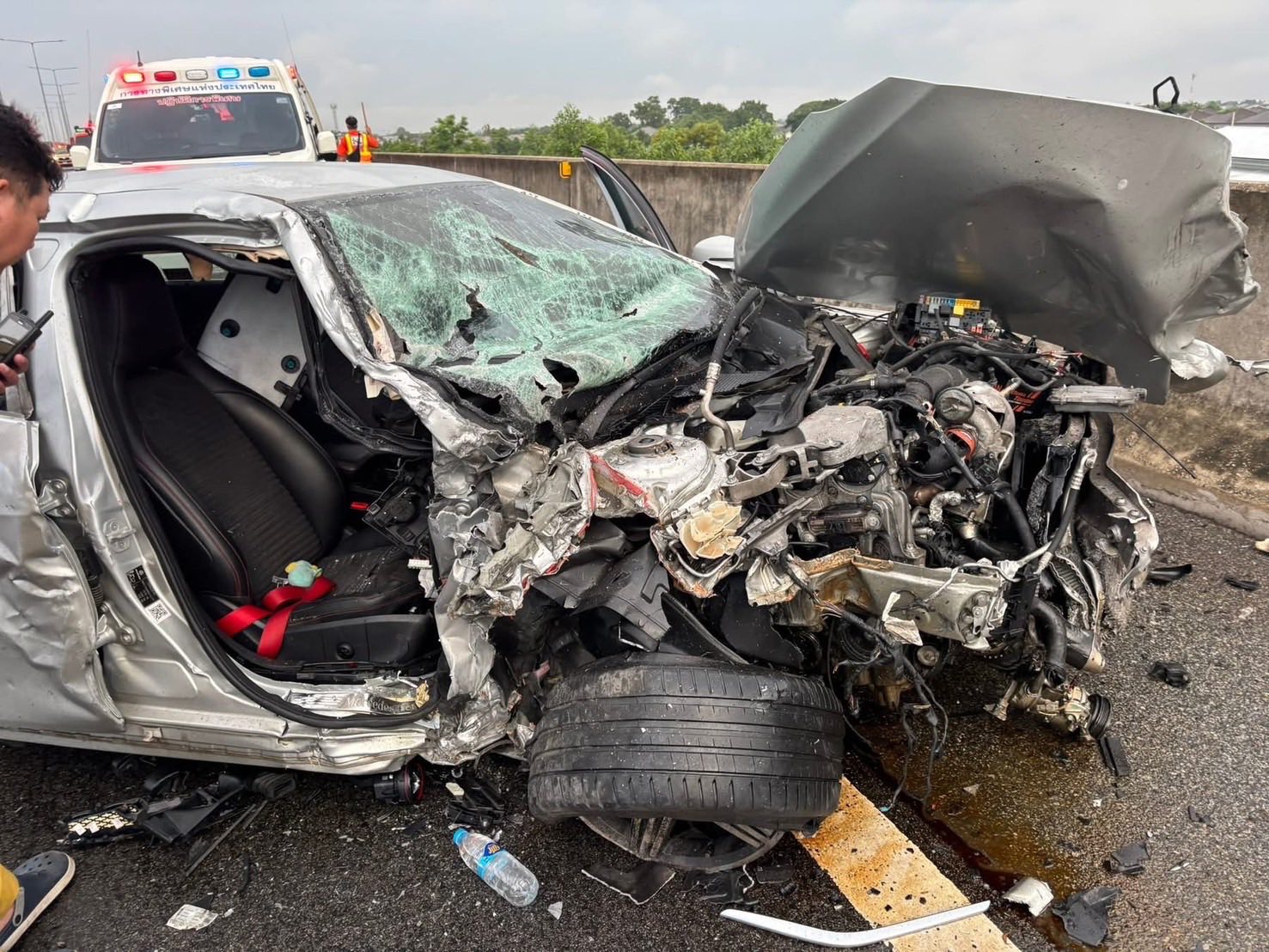 ที่เกิดเหตุเป็นถนน 3 ช่องทางจราจร ในช่องทางซ้ายสุด พบรถยนต์เมอร์ซิเดส-เบนซ์ A250 สีเทา สภาพหน้ารถพังยับเยิน โดยมีผู้ขับขี่เป็นชาย อายุ 22 ปีได้รับบาดเจ็บอาการสาหัสติดคาซากรถ ใกล้กันพบรถยนต์ ยี่ห้อแลนด์โรเวอร์ สีขาว สภาพหน้ารถพังยับเยินพลิกคว่ำหงายท้องล้อชี้ฟ้า โดยมีผู้ขับขี่เป็นหญิง อายุ 26 ปีบาดเจ็บอาการขาผิดรูปท่อนบน และมีแผลใบหน้า เจ้าหน้าที่จึงเร่งช่วยเหลือผู้บาดเจ็บทั้ง 2 รายนำตัวส่งโรงพยาบาลสายไหมและโรงพยาบาลสินแพทย์รามอินทรา