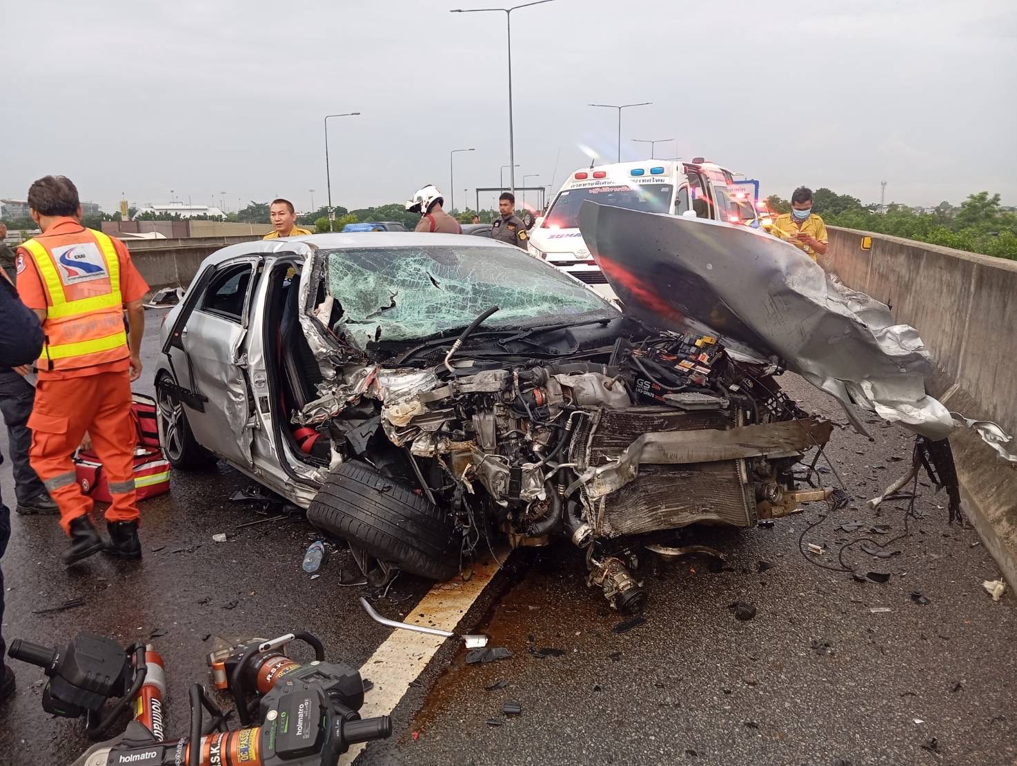 เจ้าหน้าที่สอบสวนทราบว่า ก่อนเกิดเหตุมีรถแลนด์โรเวอร์ ขับขี่ด้วยความเร็วย้อนศรขึ้นทางด่วน ขณะที่รถเมอร์ซิเดสเบนซ์ ขับมาตามทางปกติบนทางด่วน เมื่อมาถึงบริเวณที่เกิดเหตุทำให้รถยนต์ทั้ง 2 คันขับไม่เบรกจึงพุ่งชนประสานงากันอย่างแรง ส่งผลให้มีผู้บาดเจ็บ 2 ราย