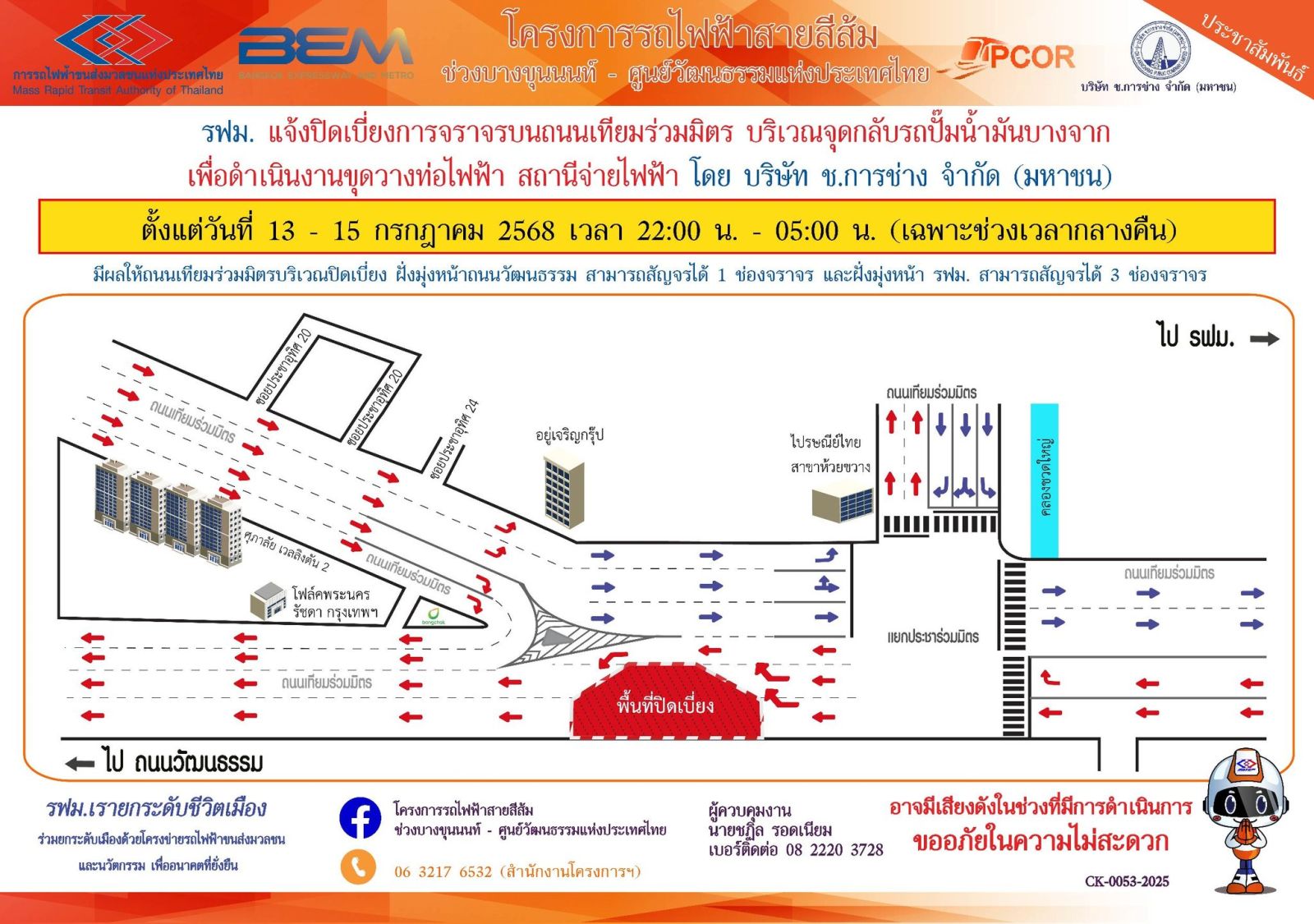 การรถไฟฟ้าขนส่งมวลชนแห่งประเทศไทย (รฟม.) แจ้งว่า บริษัท ช.การช่าง จำกัด (มหาชน) ผู้รับจ้างออกแบบและก่อสร้างอุโมงค์ทางวิ่งและสถานีใต้ดิน โครงการรถไฟฟ้าสายสีส้ม ช่วงบางขุนนนท์ – ศูนย์วัฒนธรรมแห่งประเทศไทย มีความจำเป็นต้องปิดเบี่ยงการจราจร บนถนนเทียมร่วมมิตร บริเวณจุดกลับรถปั๊มน้ำมันบางจาก เพื่อดำเนินงานขุดวางท่อไฟฟ้า สถานีจ่ายไฟฟ้า ตั้งแต่วันที่ 9 – 15 กรกฎาคม 2568 เวลา 22.00 - 05.00 น. (เฉพาะช่วงเวลากลางคืน) โดยมีรายละเอียดดังนี้