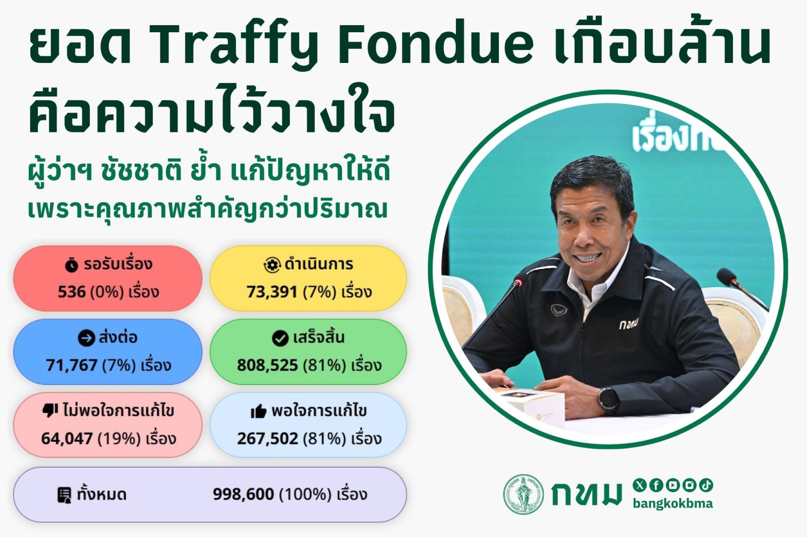 ผู้ว่าฯ ชัชชาติ กล่าวว่า ขณะนี้ Traffy Fondue มีเรื่องที่แจ้งเข้ามาให้เราแก้ไขเกือบครบ 1 ล้านเรื่องแล้ว คาดว่าขาดอีกประมาณ 2,000 เรื่อง ต้องขอขอบคุณทุกคนที่ช่วยกันแก้ไขปัญหาให้แก่ประชาชน อย่างไรก็ตาม ยังมีการพบการแก้ไขปัญหาแบบมักง่าย เช่น นำรูปอื่นมารายงานปิดเคสโดยไม่ได้แก้ไขปัญหาจริง จึงขอให้ผู้อำนวยการเขตติดตามด้วยว่าเป็นรูปจริงหรือไม่ ขอให้คงเรื่อง “คุณภาพ” ไว้ อย่าแก้ปัญหาเพียงเพื่อให้แล้วๆ ไป เราไม่ต้องการแค่ปริมาณ แต่เราต้องการคุณภาพด้วย