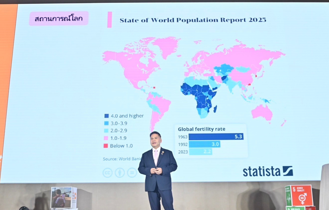 นายวราวุธ กล่าวว่า เรื่องประชากรกลายเป็นเรื่องที่สำคัญที่เร่งด่วนในระดับโลก เนื่องจากรายงานสถานการณ์ประชากรโลกของสหประชาชาติประจำปี 2025 หรือ UN State of World Population 2025 สะท้อนให้เห็นถึงการลดลงของอัตราการเจริญพันธุ์ในหลายประเทศทั่วโลก เป็นสัญญาณอันตรายที่จะนำไปสู่สภาวะ “Population Collapse” หรือการล่มสลายของโครงสร้างประชากร และการเจริญพันธุ์ ซึ่งสภาพแวดล้อมเป็นปัจจัยหลักที่ทำให้คนอยากหรือไม่อยากมีบุตร ท่ามกลางความท้าทายต่างๆ อาทิ เศรษฐกิจ ความขัดแย้ง โลกร้อน มลพิษ เทคโนโลยี และอื่นๆ ในขณะที่สถานการณ์ในประเทศไทยนั้น กำลังเผชิญ “วิกฤตประชากร”สังคมสูงวัย อัตราการเกิดต่ำ เด็กมีคุณภาพและผลิตภาพจำกัด และกำลังก้าวเข้าสู่ “สังคมสูงอายุระดับสุดยอด” ภายในอีกไม่ถึง 10 ปี ซึ่งหมายความว่าสังคมไทยจะมีคนที่อายุมากกว่า 60 ปี ถึง 1 ใน 3 ของคนไทยทั้งหมด ซึ่งปัญหาจะทวีความรุนแรงยิ่งขึ้น หากไม่เร่งแก้ไข โดยจะส่งผลกระทบต่อการพัฒนาเศรษฐกิจ สังคม และวิถีชีวิตของทุกคน โดยเฉพาะ “เดอะแบก” และภายในปี 2583 คนวัยทำงาน 100 คน จะต้องเลี้ยงดูผู้พึ่งพิงเกือบ 90 คน