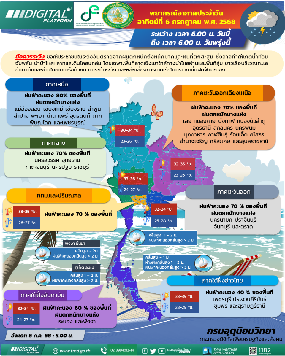 ลักษณะอากาศทั่วไป พยากรณ์อากาศ 24 ชั่วโมงข้างหน้า ภาคเหนือ ภาคตะวันออกเฉียงเหนือ ภาคตะวันออก และภาคใต้มีฝนตกหนักบางแห่ง ขอให้ประชาชนในบริเวณจังหวัดภาคเหนือ ภาคตะวันออกเฉียงเหนือ ภาคตะวันออก และภาคใต้ ระวังอันตรายจากฝนตกหนักและฝนที่ตกสะสม ซึ่งอาจทำให้เกิดน้ำท่วมฉับพลันน้ำป่าไหลหลาก โดยเฉพาะพื้นที่ลาดเชิงเขาใกล้ทางน้ำไหลผ่านและพื้นที่ลุ่ม