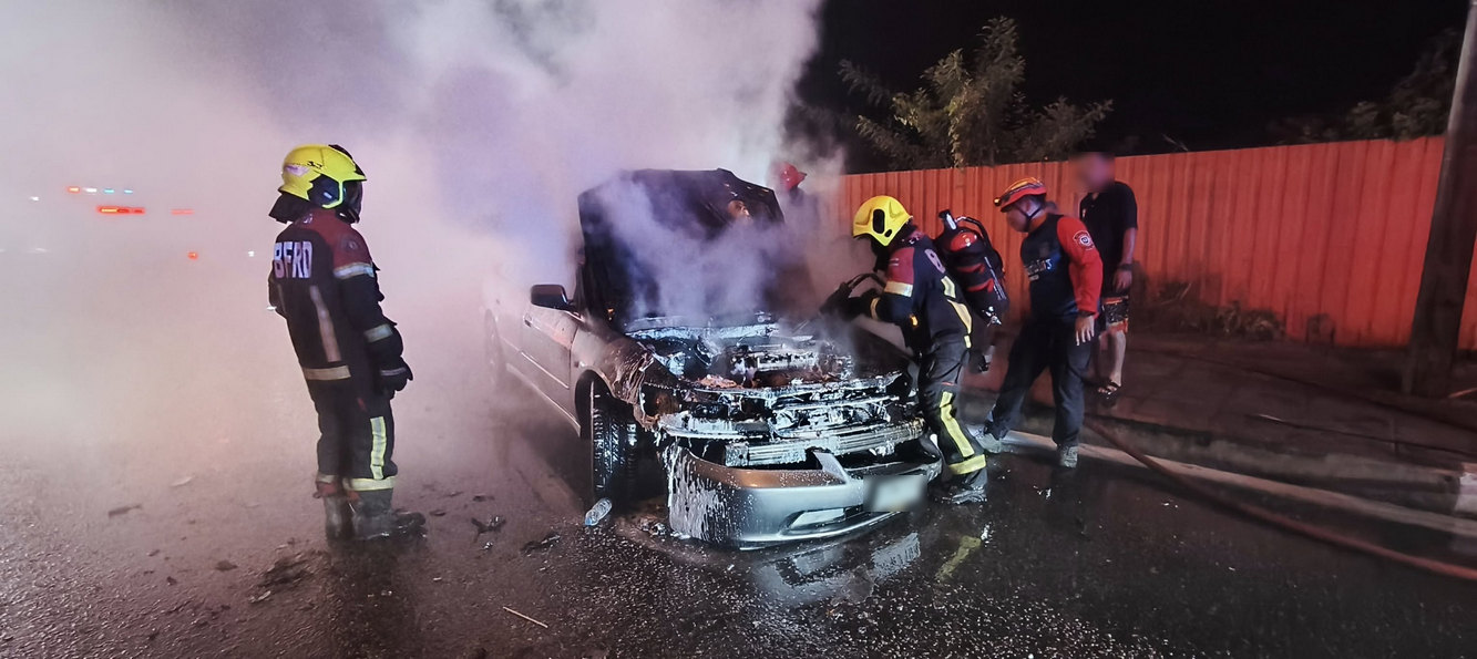 ลักษณะที่เกิดเหตุเป็นรถยนต์นั่งส่วนบุคคล ชนิดเก๋ง สีเขียว ป้ายทะเบียน กรุงเทพมหานคร รถใช้น้ำมันเบนซินเป็นเชื้อเพลิง เพลิงลุกไหม้เสียหายบริเวณห้องเครื่องลุกลามห้องโดยสาร อาสาสมัครใช้น้ำทำการดับเพลิงสงบ ก่อนรถดับเพลิงถึงที่เกิดเหตุ และทางเจ้าหน้าที่ใช้น้ำทำการระบายความร้อน