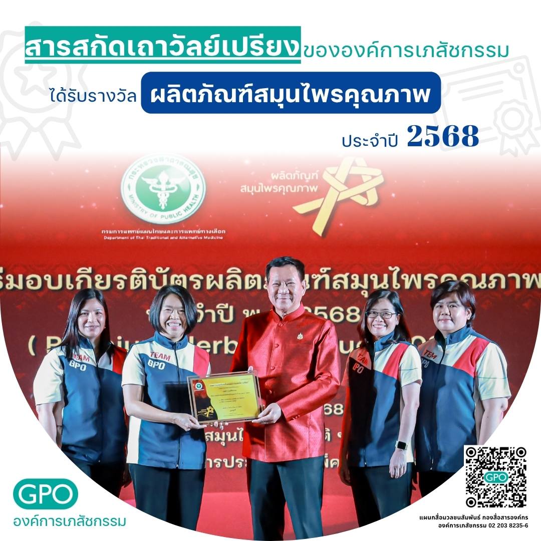 ผู้เชี่ยวชาญพิเศษ กล่าวว่า รางวัลผลิตภัณฑ์สมุนไพรคุณภาพ ประจำปี 2568 (Premium Herbal Products 2025) ที่องค์การฯ ได้รับเป็นผลิตภัณฑ์แคปซูลสารสกัดเถาวัลย์เปรียง 2 รายการ ได้แก่ จีพีโอ เถาวัลย์เปรียง (แคปซูล 200 มิลลิกรัม) และ จีพีโอ เถาวัลย์เปรียง (แคปซูล 400 มิลลิกรัม) ซึ่งได้รับการคัดเลือกใหม่ และมีอายุการรับรองเป็นระยะเวลา 3 ปี (ปี พ.ศ.2568 - 2570) ซึ่งเป็นสมุนไพรคุณภาพจากองค์การเภสัชกรรม โดยรางวัลที่องค์การฯ ได้รับในครั้งนี้ เกิดจากกรมการแพทย์แผนไทยและการแพทย์ทางเลือกได้คัดเลือกผลิตภัณฑ์สมุนไพรที่มีคุณภาพได้มาตรฐาน เพื่อเพิ่มช่องทางการตลาดให้ผู้ประกอบการด้านสมุนไพรไทย ทำให้ประชาชนได้รู้จัก ทำให้เกิดความเชื่อมั่น มีความชอบและอยากใช้ผลิตภัณฑ์สมุนไพรมากขึ้น