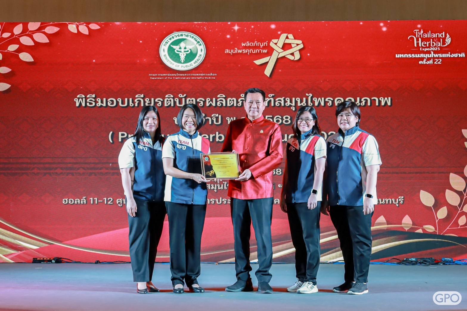 เมื่อวันที่ 4 กรกฎาคม 2568 ภญ.ยุวพร ศรีน้อย ผู้เชี่ยวชาญพิเศษ องค์การเภสัชกรรม เข้ารับเกียรติบัตรรางวัลเชิดชูเกียรติผลิตภัณฑ์สมุนไพรคุณภาพ จากนายโฆสิต สุวินิจจิต ที่ปรึกษารัฐมนตรีว่าการกระทรวงสาธารณสุข ในงานมหกรรมสมุนไพรแห่งชาติ และการประชุมวิชาการประจำปีการแพทย์แผนไทยการแพทย์พื้นบ้านและการแพทย์ทางเลือก ครั้งที่ 22 ณ ฮอลล์ 11-12 ศูนย์แสดงสินค้าและการประชุม อิมแพ็ค เมืองทองธานี จังหวัดนนทบุรี