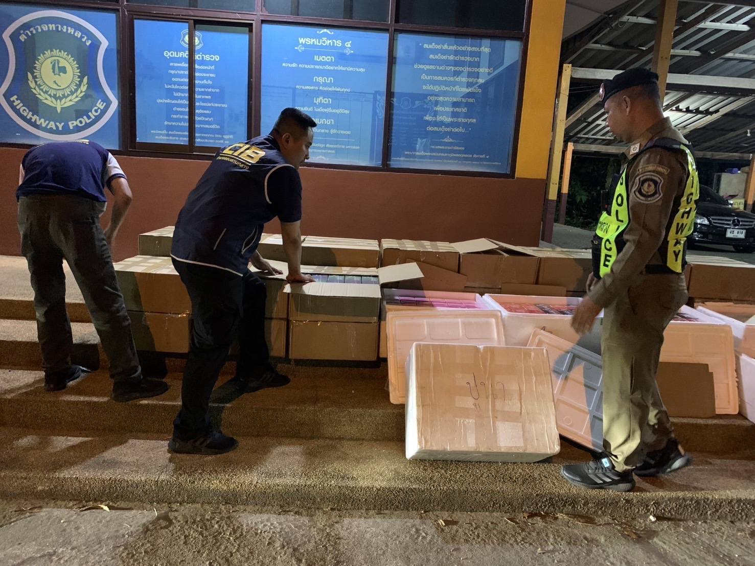 โดยใช้รถยนต์กระบะตู้ทึบตอนเดียวสีน้ำเงินทะเบียน สุราษฎร์ธานี เป็นยานพาหนะใช้การขนส่ง กำลังขับขี่รถยนต์คันดังกล่าวอยู่บนถนนทางหลวงหมายเลข 4 ผ่านอำเภอบางกล่ำ จังหวัดสงขลา มุ่งหน้ากรุงเทพฯ ให้เจ้าหน้าที่ทำการตรวจสอบ พบรถยนต์กระบะดังกล่าวข้างต้นขับมาบริเวณจุดสกัด ตรงกับที่สายลับแจ้ง ตรวจค้น ภายในตู้ทึบพบลังโฟมเขียนระบุว่า “ปูนา” แต่เมื่อเปิดตรวจสอบภายในกลับพบตัวเครื่องบุหรี่ไฟฟ้าและหัวน้ำยาบุหรี่ไฟฟ้า ภายในตู้ทึบ