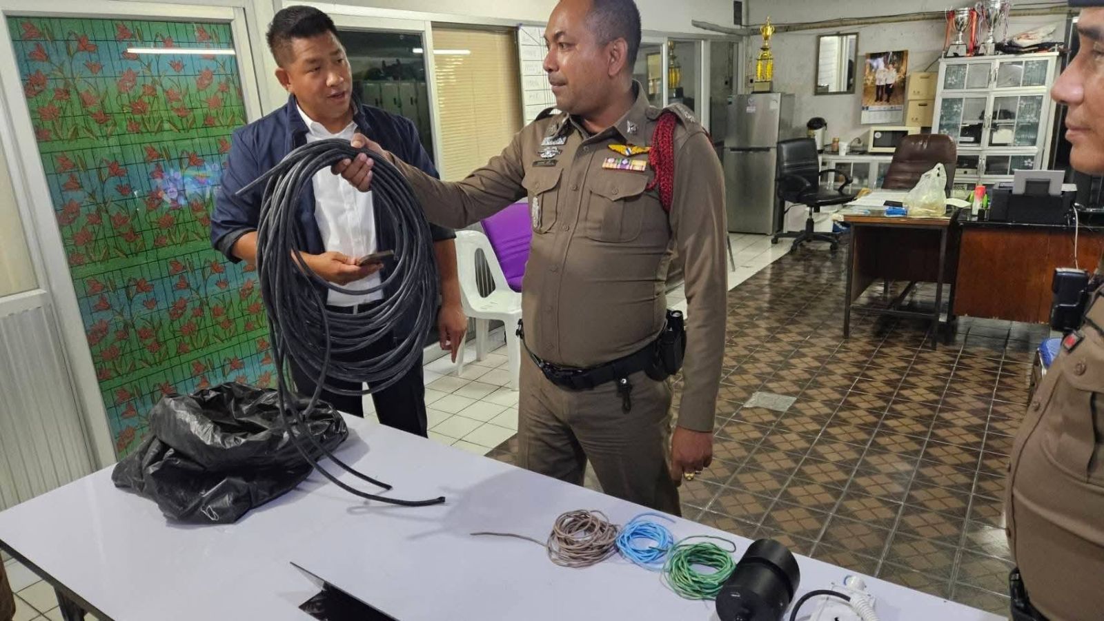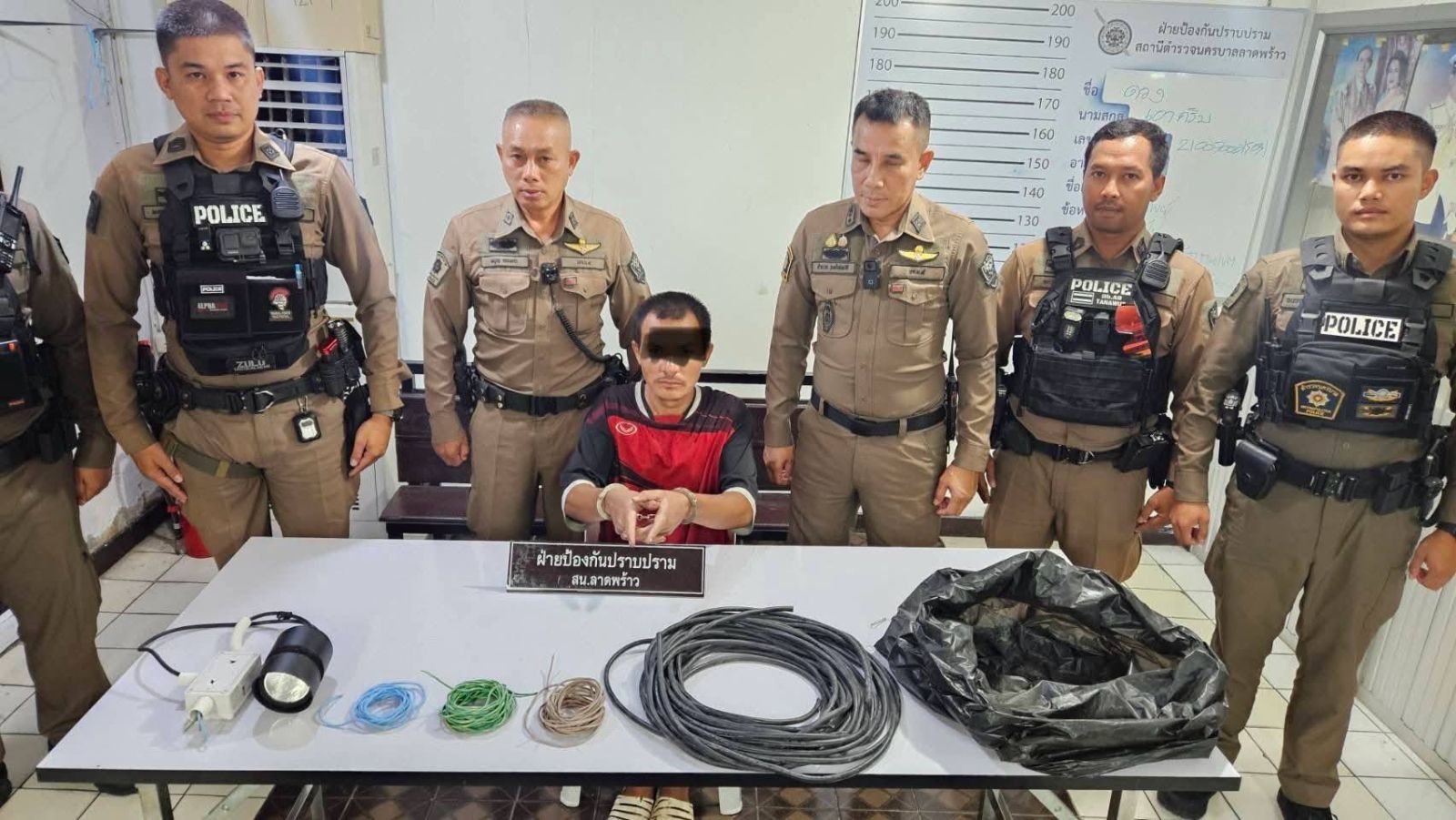 จากการสอบสวน ผู้ต้องหาแจ้งว่าได้ลักสายไฟบริเวณดังกล่าวจริง เจ้าพนักงานตำรวจชุดจับกุมจึงได้แจ้งข้อกล่าวหาให้ผู้ถูกจับทราบว่า “ลักทรัพย์” และได้ควบคุมตัวผู้ถูกจับกุมมายัง สน.ลาดพร้าว เพื่อดำเนินคดีตามกฎหมายต่อไป