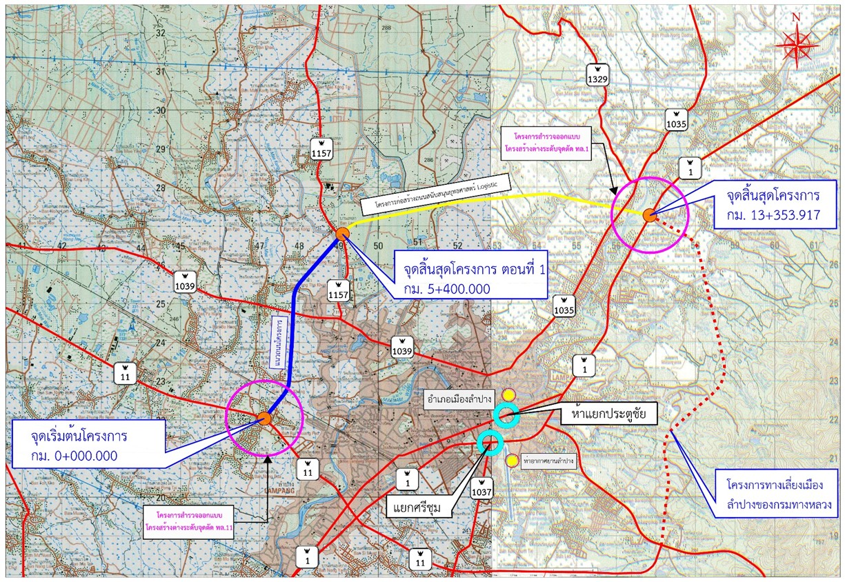 กรมทางหลวงชนบท พัฒนาโครงสร้างพื้นฐานด้านคมนาคมขนส่งของภาคเหนือ พร้อมแบ่งเบาการจราจรบนถนนสายหลัก เดินหน้าสร้างถนนสายแยก ทล.11 - ทล.1 อำเภอเมือง จังหวัดลำปาง (ตอนที่ 1) 5.400 กิโลเมตร คาดแล้วเสร็จในปี 2570