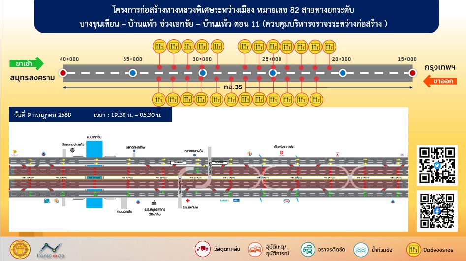 - ปิดสะพานข้ามแยกเอกชัย ด้านขาเข้า เมืองสมุทรสาคร เริ่มปิด เวลา 22.00 น. ถึง เวลา 05.00 น.