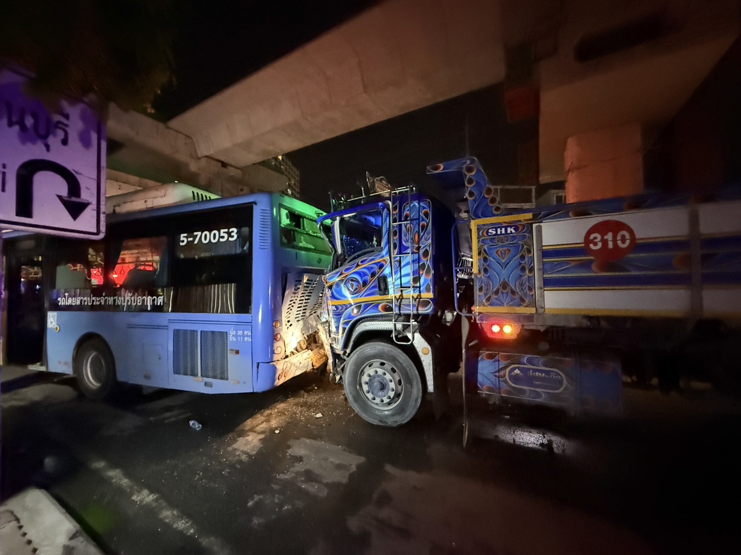 รถบรรทุกชนท้ายรถประจำทางสาย 21E กระเด็นไปโดนรถเก๋ง แล้วเสยต้นไม้ข้างทาง และรถจยย. มีผู้บาดเจ็บหลายราย และรถติดอย่างหนัก ผ่านได้เลนขวา