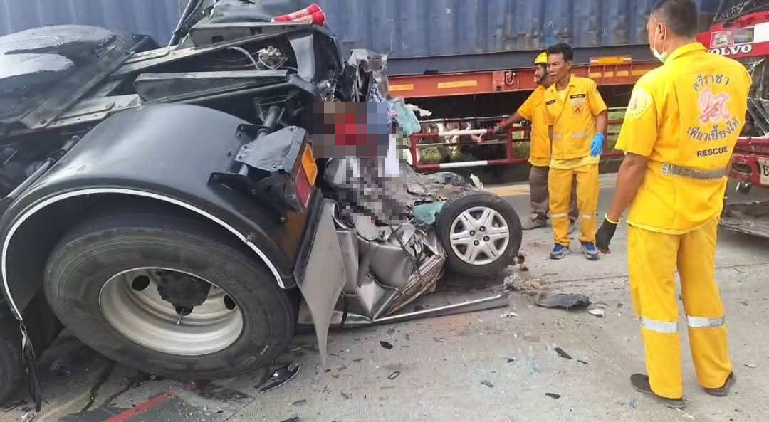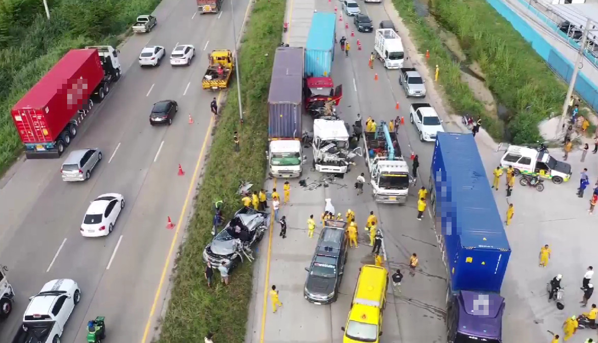 ที่เกิดเหตุ พบรถนั่งส่วนบุคคล ฮอนด้า สีเทา ป้ายทะเบียน มหาสารคาม, รถกระบะ มาสด้า สีเทา ป้ายทะเบียน กทม., รถเทรลเลอร์ มิตซูบิชิ สีขาว ป้ายทะเบียน ชลบุรี, รถเทรลเลอร์ สีขาว ป้ายทะเบียน พระนครศรีอยุธยา., รถเทรลเลอร์ วอลโว่ สีแดง ป้ายทะเบียน กทม. และ รถเทรเลอร์ สีขาว ป้ายทะเบียน กทม. สภาพชนกันเสียหายยับเยิน