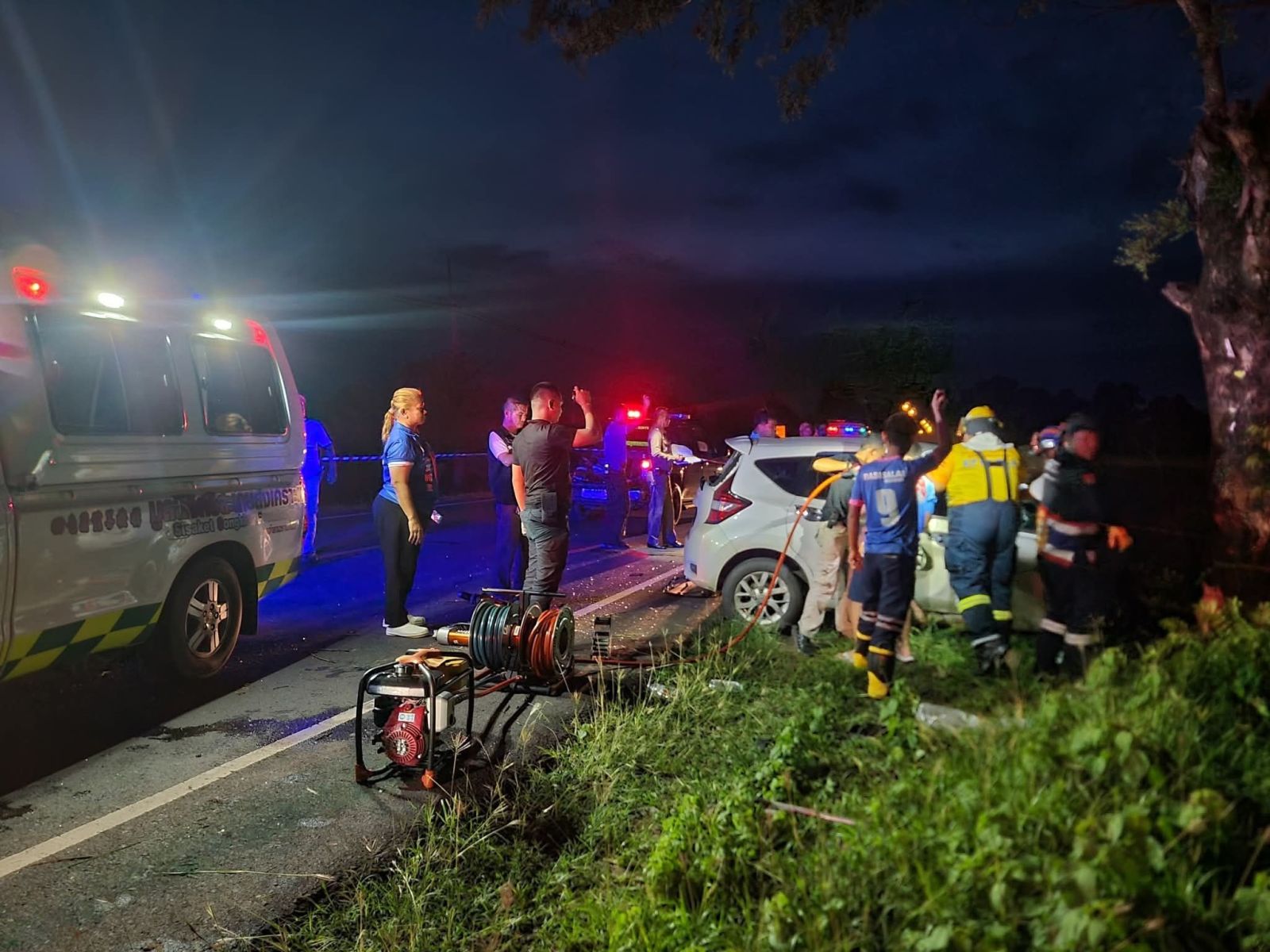 ที่เกิดเหตุ พบรถนั่งส่วนบุคคล นิสสัน โน็ต สีขาว ป้ายทะเบียน 2301 ศรีสะเกษ ลักษณะชนกับต้นไม้ข้างทาง พบว่ามีผู้ได้รับบาดเจ็บ เป็นชาย 1 ราย สภาพร่างติดภายในรถ และมีควันไฟลุกจากรถเก๋ง พลเมืองดีช่วยกันดับไฟ และได้ประสานรถน้ำดับเพลิง อบต.หนองแคร่วมสนับสนุนที่เกิดเหตุ ทางอาสาสมัครช่วยกันใช้เครื่องมือตัดถ่างงัดรถ และนำร่างคนขับออกมา ตรวจสอบพบว่าได้เสียชีวิตแล้ว เป็นผู้ชาย อายุ ประมาณ 45 ปี ในส่วนของสาเหตุที่แท้จริงนั้นอยู่ระหว่างการสอบสวนของเจ้าหน้าที่ตำรวจ สภ.ราษีไศล