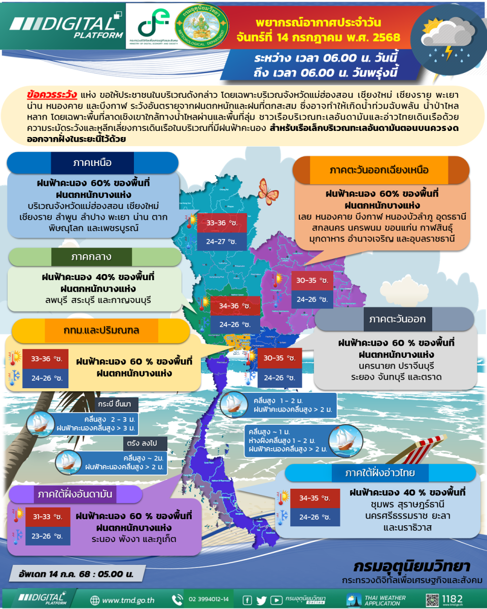 ลักษณะอากาศทั่วไป วันที่ 14 กรกฎาคม 2568 พยากรณ์อากาศ 24 ชั่วโมงข้างหน้า ประเทศไทยยังคงมีฝนฟ้าคะนองและมีฝนตกหนักบางแห่ง ขอให้ประชาชนในบริเวณดังกล่าว โดยเฉพาะบริเวณจังหวัดแม่ฮ่องสอน เชียงใหม่ เชียงราย พะเยา น่าน หนองคาย และบึงกาฬ ระวังอันตรายจากฝนตกหนักและฝนที่ตกสะสม ซึ่งอาจทำให้เกิดน้ำท่วมฉับพลัน น้ำป่าไหลหลาก โดยเฉพาะพื้นที่ลาดเชิงเขาใกล้ทางน้ำไหลผ่านและพื้นที่ลุ่ม