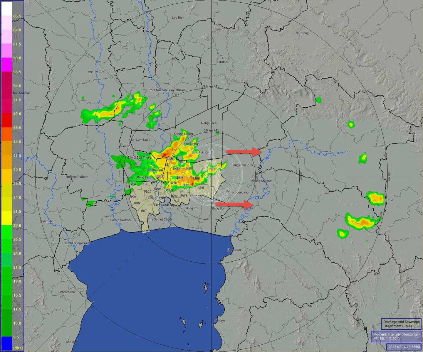 วันที่ 14 กรกฏาคม 2568 เวลา 18.30 น. กทม.ฝนเล็กน้อย - ปานกลางฝั่งพระนครชั้นในต่อเนื่องตอนบน เคลื่อนตัวทิศตะวันออก ปริมาณฝนสูงสุดเขตทวีวัฒนา 70.0 มม.