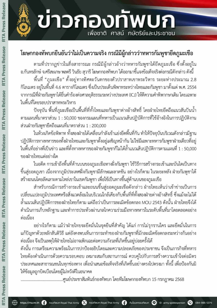 วันที่ 15 กรกฎาคม 2568 ตามที่ปรากฏข่าวในสื่อสาธารณะ กรณีมีผู้กล่าวอ้างว่าทหารกัมพูชาได้ยึดภูมะเขือ ซึ่งตั้งอยู่ใน อ.กันทรลักษ์ จ.ศรีสะเกษ