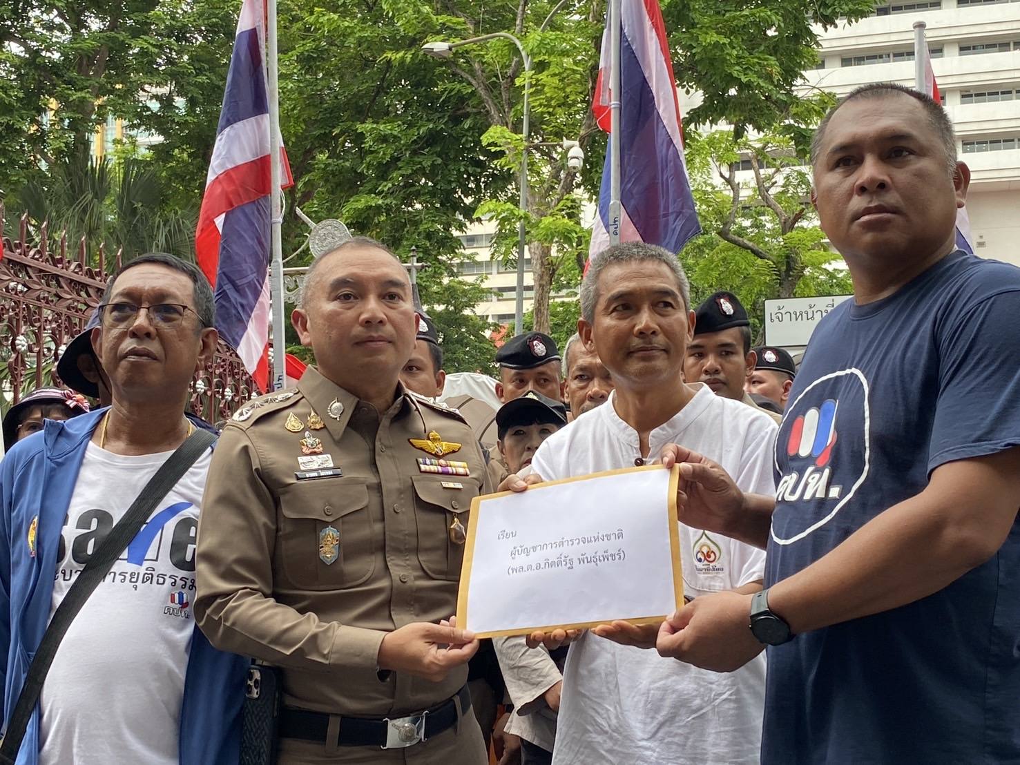 กลุ่ม ’คปท.‘ บุกทวงถาม ผบ.ตร. จี้ให้ออกจากราชการไว้ก่อน 2 แพทย์ใหญ่ รพ.ตำรวจ ปมเอื้อ ‘ทักษิณ’ พักรักษาตัวชั้น 14 พร้อมสั่งตั้งกรรมการสอบวินัย-อาญา