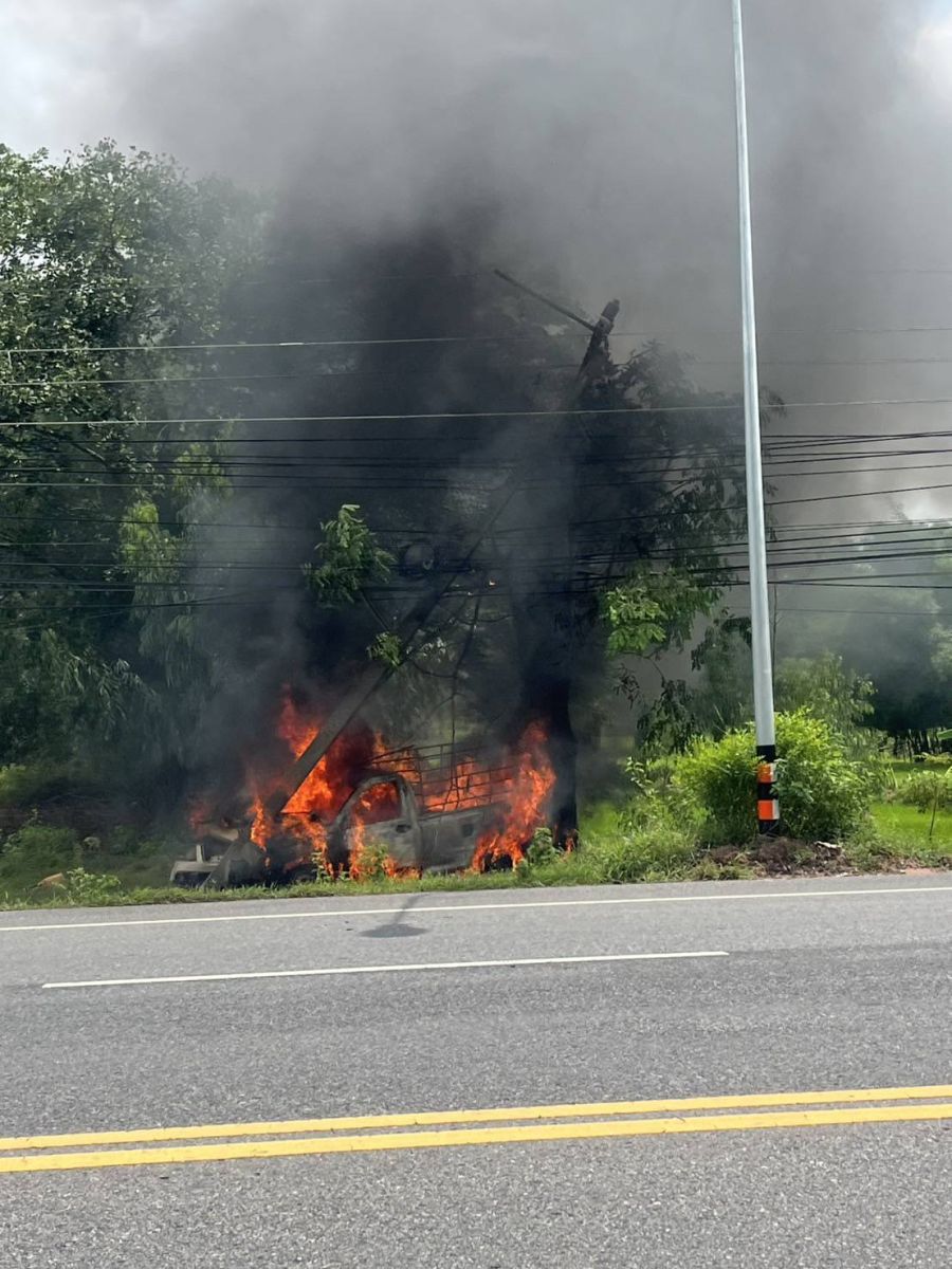 รถกระบะเสียหลักชนเสาไฟฟ้าริมถนนสาย โกสุมพิสัย-มหาสารคาม แล้วเกิดเพลิงลุกไหม้ทั้งคัน คนขับหนีตายรอดหวุดหวิด จ.มหาสารคาม