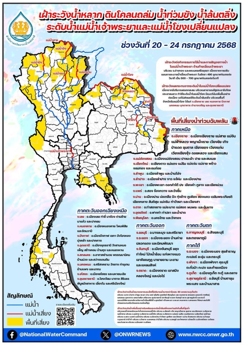 สำนักงานทรัพยากรน้ำแห่งชาติ (สทนช.) ได้ติดตามการคาดการณ์สภาพอากาศพบว่า จะมีฝนตกหนักถึงหนักมากบางแห่ง ทั้งนี้ สทนช. ได้ประเมินวิเคราะห์สภาพอากาศ สถานการณ์น้ำ และคาดการณ์พื้นที่เสี่ยงน้ำหลาก ดินโคลนถล่ม ร่วมกับกรมอุตุนิยมวิทยา สถาบันสารสนเทศทรัพยากรน้ำ (องค์การมหาชน) กรมทรัพยากรน้ำ กรมทรัพยากรธรณี กรมชลประทาน การไฟฟ้าฝ่ายผลิตแห่งประเทศไทย และกรมป้องกันและบรรเทาสาธารณภัย พบว่ามีพื้นที่บางส่วนเสี่ยงต้องเฝ้าระวังน้ำท่วมฉับพลัน น้ำป่าไหลหลาก ดินโคลนถล่ม น้ำท่วมขังในเขตชุมชนเมืองที่เกิดน้ำท่วมขังอยู่เป็นประจำ เนื่องจากระบายไม่ทันและระดับน้ำโขงเปลี่ยนแปลง ในช่วงวันที่ 20 - 24 กรกฎาคม 2568 ดังนี้