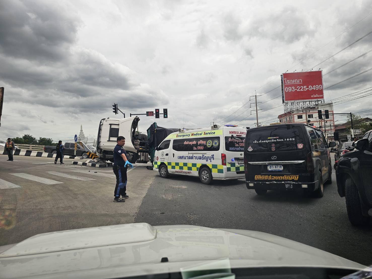 ถนนรังสิต-นครนายก ขาเข้า ช่วงคลอง 7 อุบัติเหตุ รถพ่วง 18 ล้อเสียหลักพลิกตะแคง กีดขวางเกือบทุกช่องทาง รถติดมาก ท้ายแถวสะสม 1 กม. ส่วนฝั่งขาออก ติดเหมือนกัน ท้ายแถวสะสมเกือบ 2 กม.