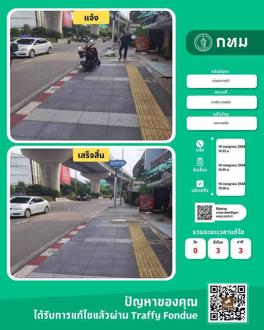 โฆษกของกรุงเทพมหานคร กล่าวเพิ่มเติมว่า ขอขอบคุณเพจ “ฟุตบาทไทยสไตล์” ที่ช่วยเป็นกระบอกเสียงให้คนกรุงเทพฯ พร้อมขออภัยอย่างสูงต่อเหตุการณ์ที่เกิดขึ้น โดยยืนยันว่า เจ้าหน้าที่ผู้ตอบเรื่องร้องเรียนได้ยอมรับผิดแล้ว และจะถูกดำเนินการทางวินัยตามขั้นตอนของกฎหมาย ทั้งนี้ สำนักงานเขตบางพลัดได้ดำเนินการตรวจสอบใหม่ทันทีตั้งแต่วันที่ 17 ก.ค. 68 และส่งหนังสือแจ้งผู้กระทำผิดเพื่อดำเนินการตามกฎหมายอีกครั้ง หากประชาชนพบการ “ปิดเรื่องปลอม” หรือข้อมูลไม่ถูกต้องในระบบ Traffy Fondue สามารถกดเปิดเรื่องใหม่ได้ทันที