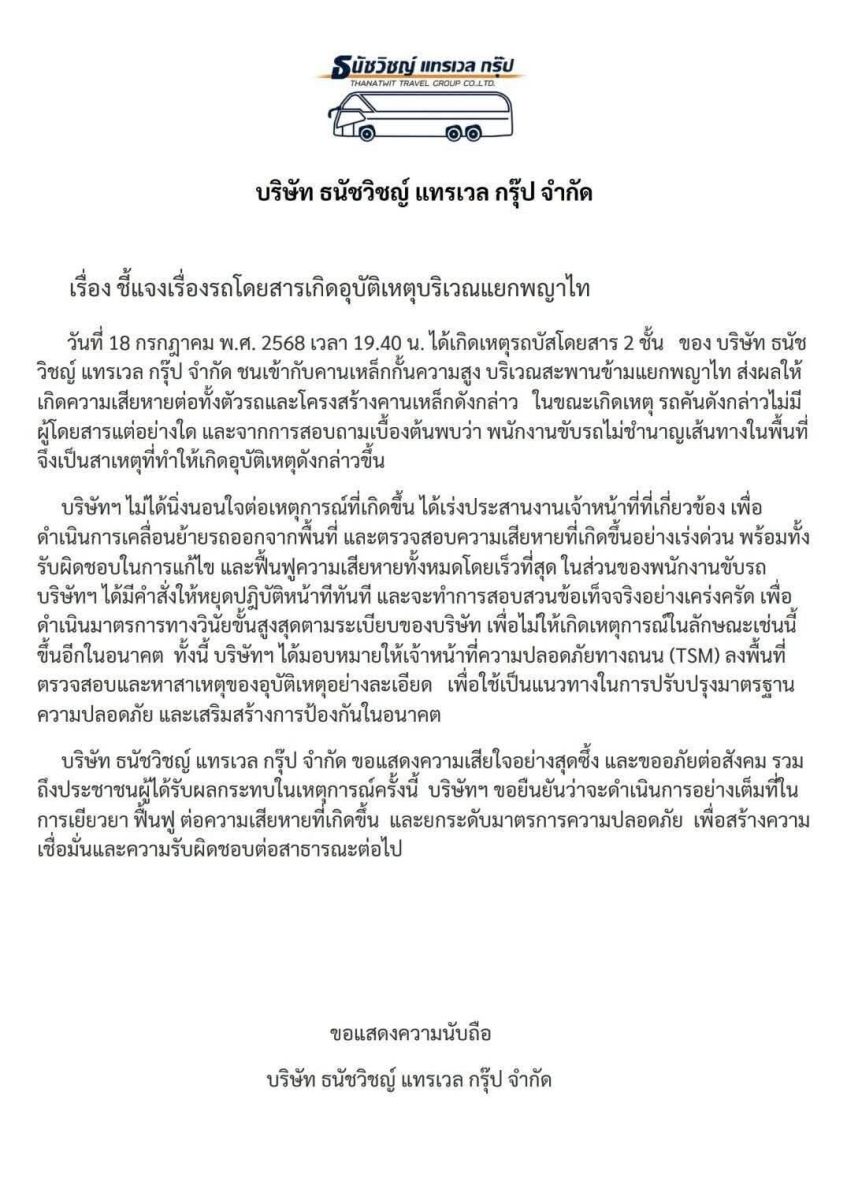 19 กรกฎาคม 2568 จากกรณีรถบัส 2 ชั้น พุ่งชนคานกั้นความสูง บนถนนศรีอยุธยา ฝั่งขาเข้า บริเวณสะพานข้ามแยกพญาไท เสียหายเมื่อช่วงค่ำวานนี้ ล่าสุด บริษัท ธนัชวิชญ์ แทรเวล กรุ๊ป จำกัด ออกแถลงการณ์ถึงเรื่องดังกล่าว รายละเอียดระบุว่า วันที่ 18 กรกฎาคม พ.ศ. 2568 เวลา 19.40 น. ได้เกิดเหตุรถบัสโดยสาร 2 ชั้น ของ บริษัท ธนัชวิชญ์ แทรเวล กรุ๊ป จำกัด ชนเข้ากับคานเหล็กกันความสูง บริเวณสะพานข้ามแยกพญาไท ส่งผลให้เกิดความเสียหายต่อทั้งตัวรถและโครงสร้างคานเหล็กดังกล่าว ในขณะเกิดเหตุ รถคันดังกล่าวไม่มีผู้โดยสารแต่อย่างใด และจากการสอบถามเบื้องต้นพบว่า พนักงานขับรถไม่ชำนาญเส้นทางในพื้นที่จึงเป็นสาเหตุที่ทำให้เกิดอุบัติเหตุดังกล่าวขึ้น
