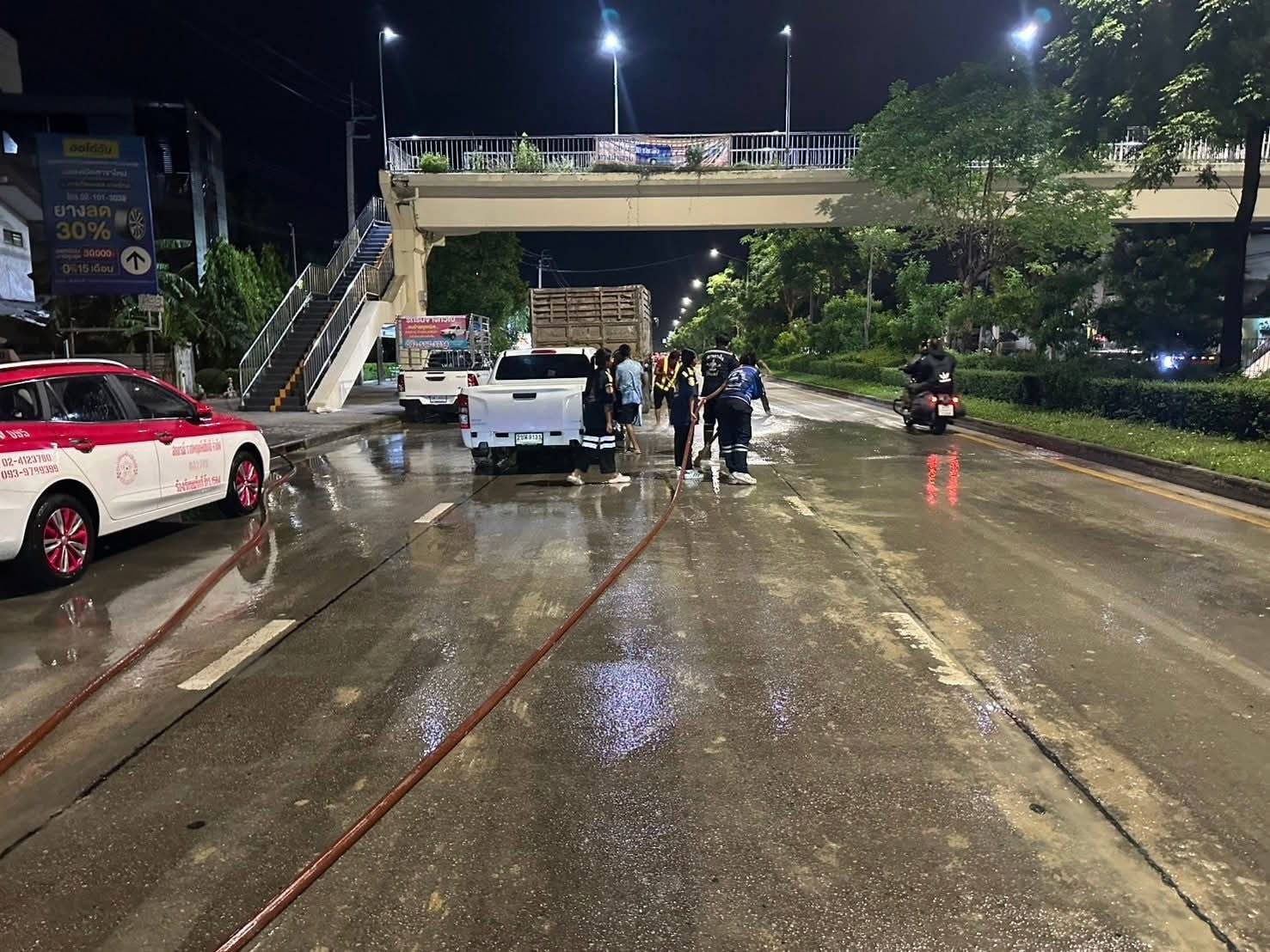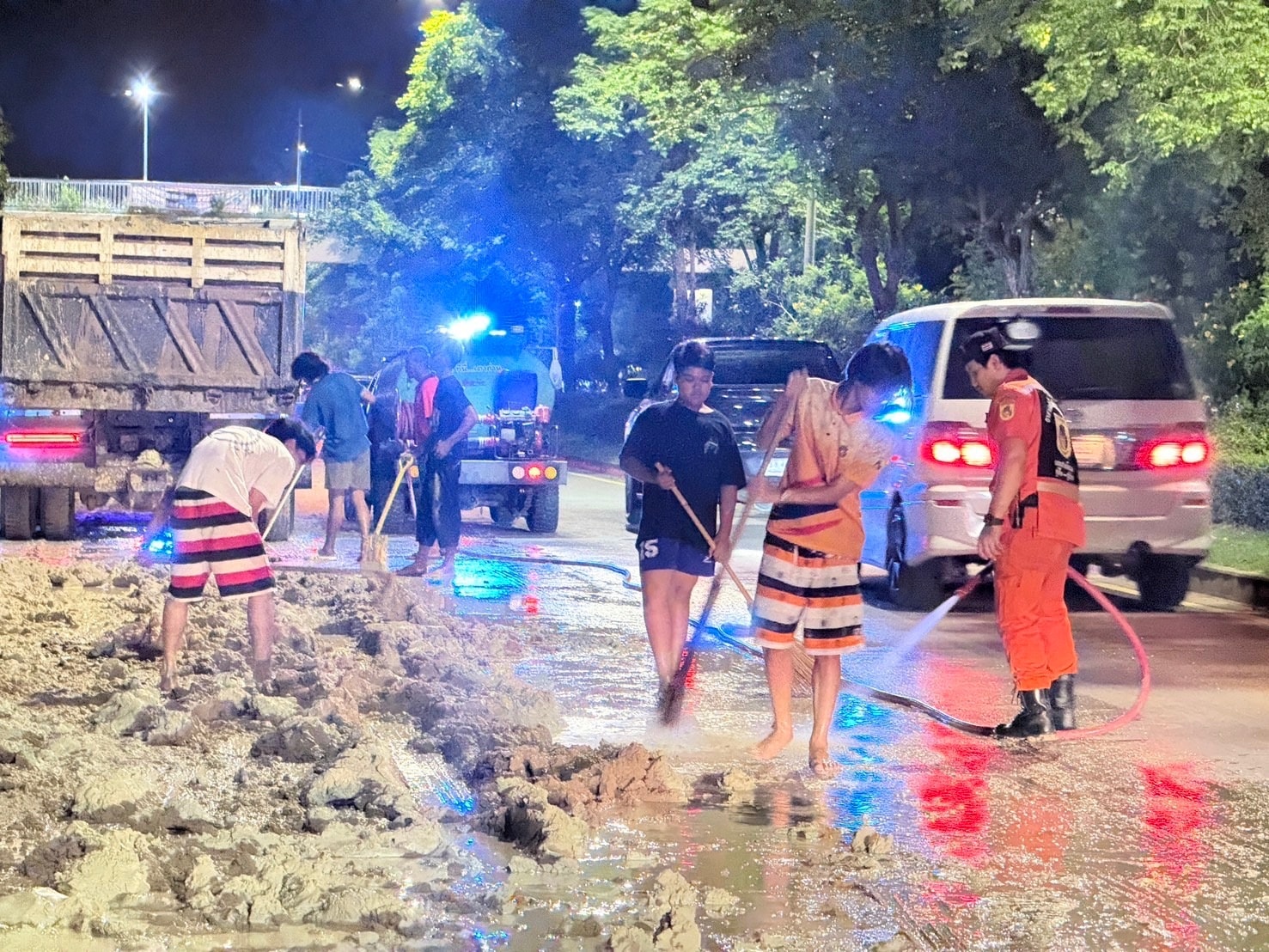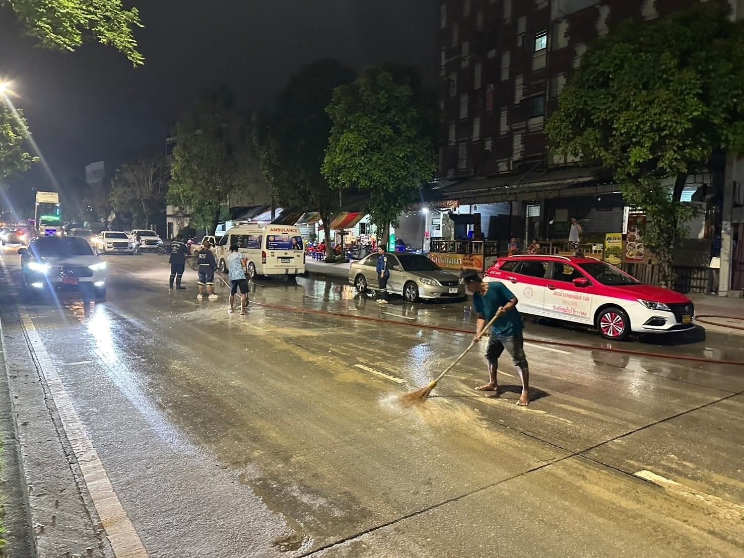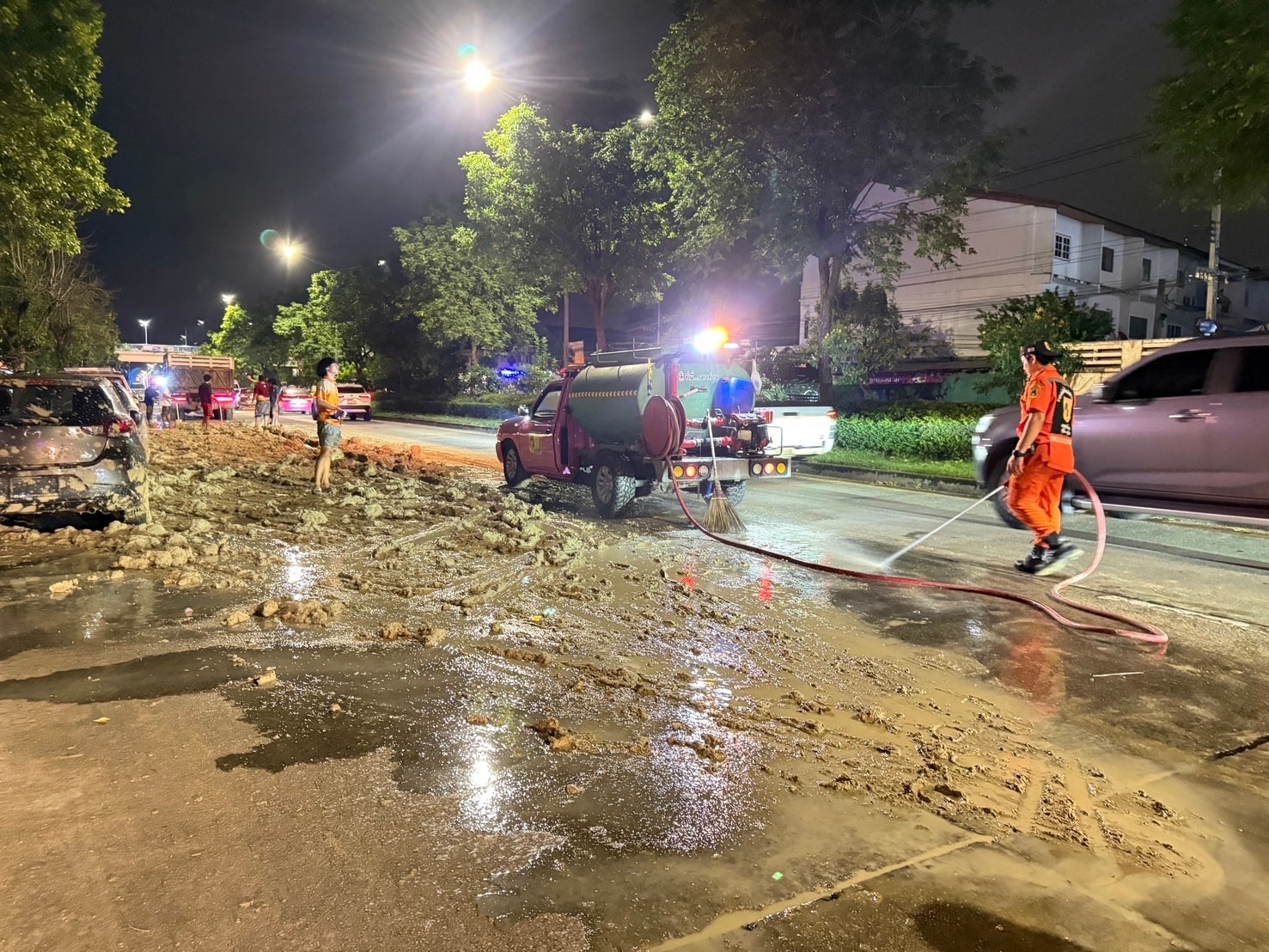 ต่อมา เมื่อเวลา 02.50 น. เจ้าหน้าที่รถน้ำเขต พร้อมด้วย อปพร.สายไหม ระดมกำลังอาสาฯ มาช่วยกันกวาดถนนและล้างดินโคลนบนถนน จนล่าสุดการจราจรบนถนนกลับมาใช้งานได้ตามปกติ