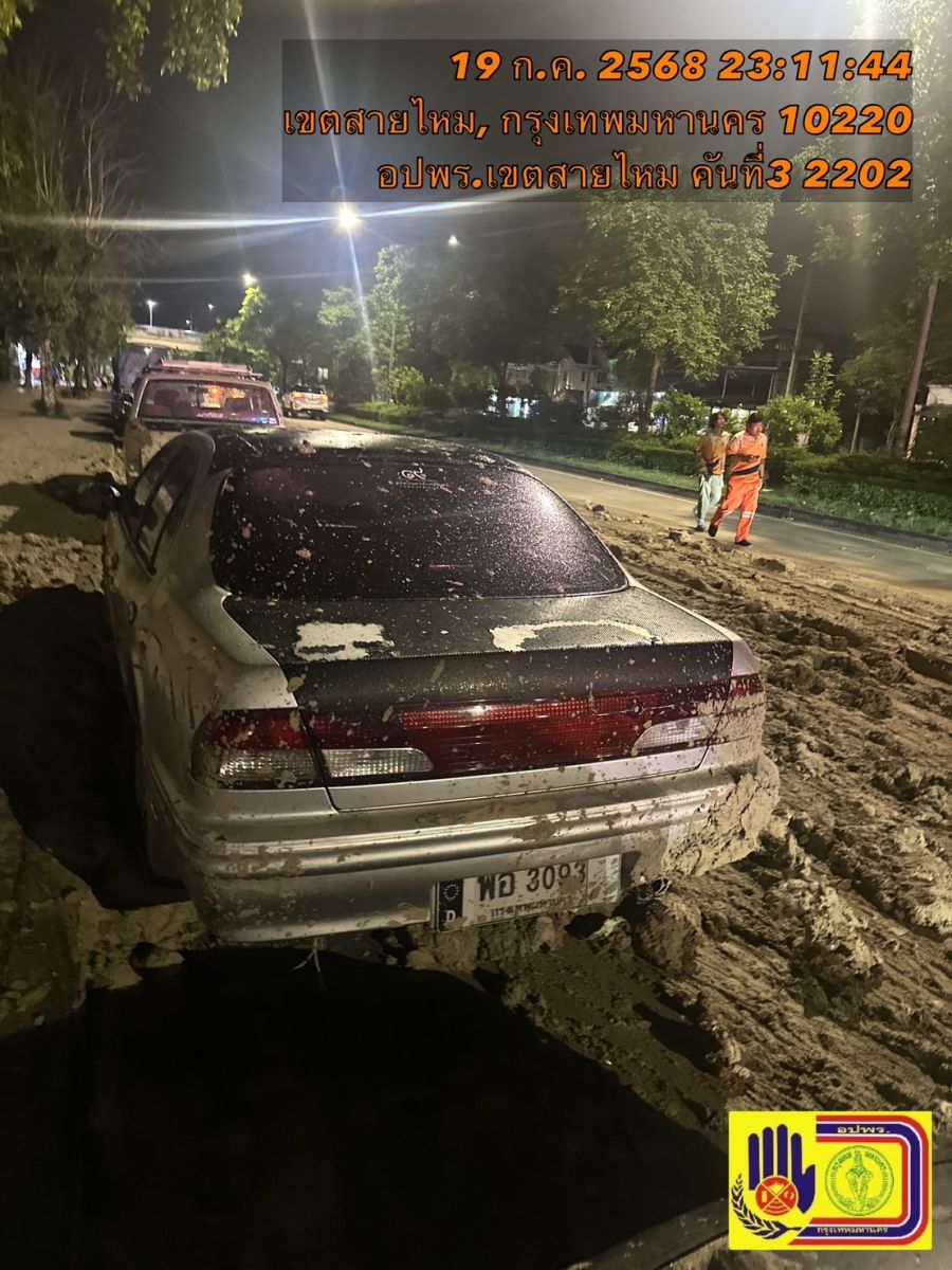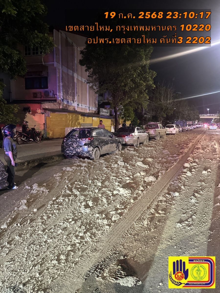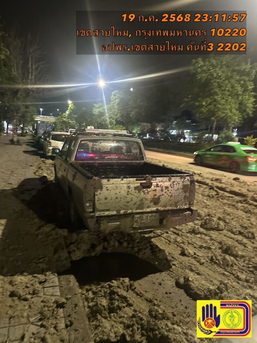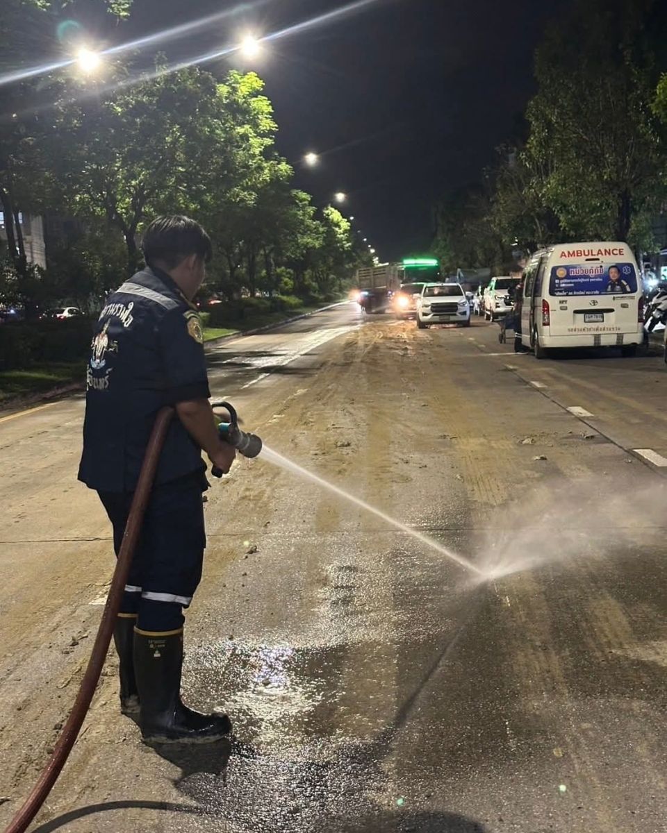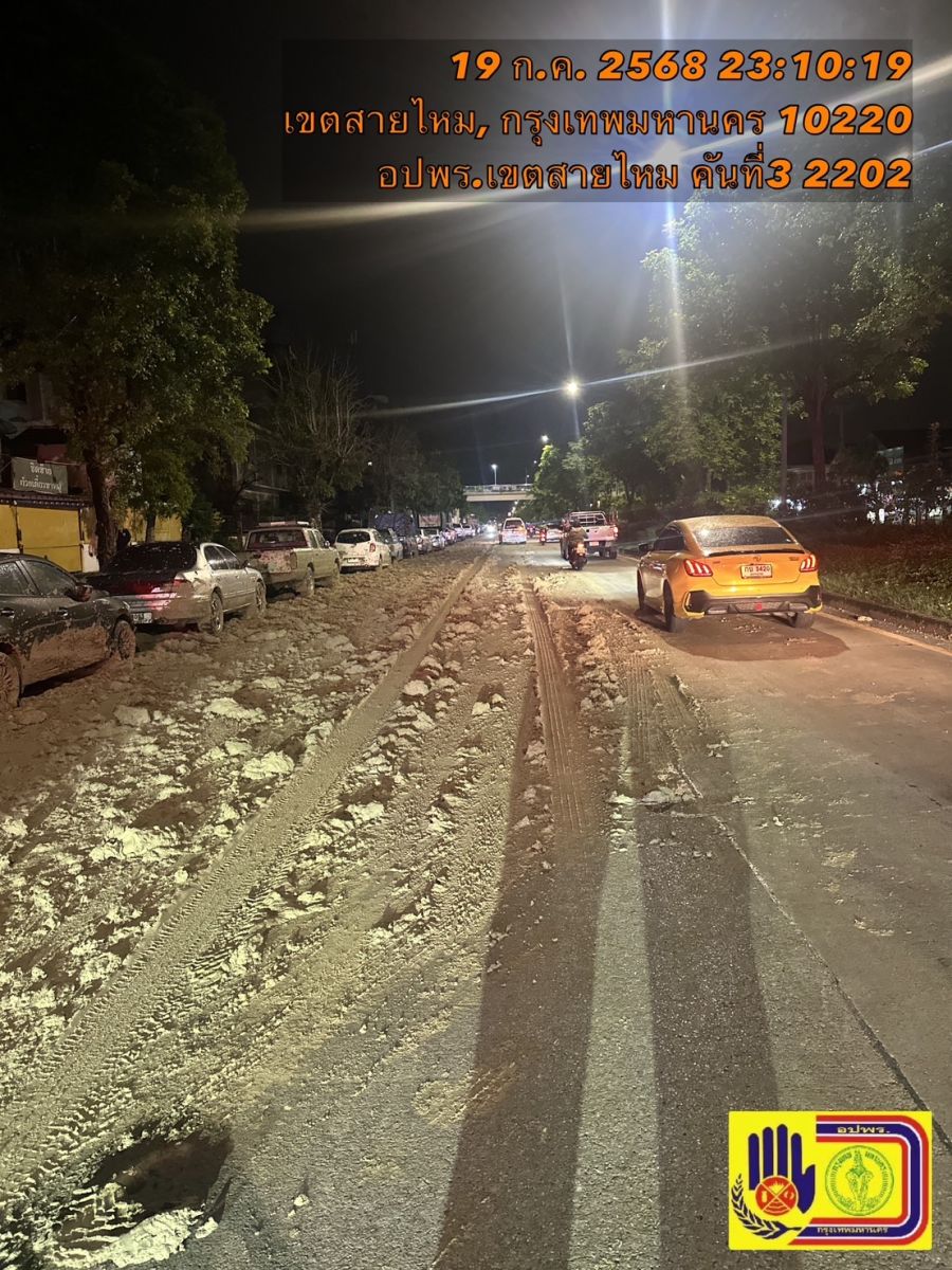 วันที่ 20 ก.ค.68 เวลา 00.30 น. ศูนย์วิทยุ อปพร.สายไหม รับแจ้ง มีรถขนดินโคลน ทำดินหกหล่น ตกใส่รถยนต์ชาวบ้านที่จอดริมข้างทาง บนถนนเทพรักษ์ แขวงคลองถนน เขตสายไหม
