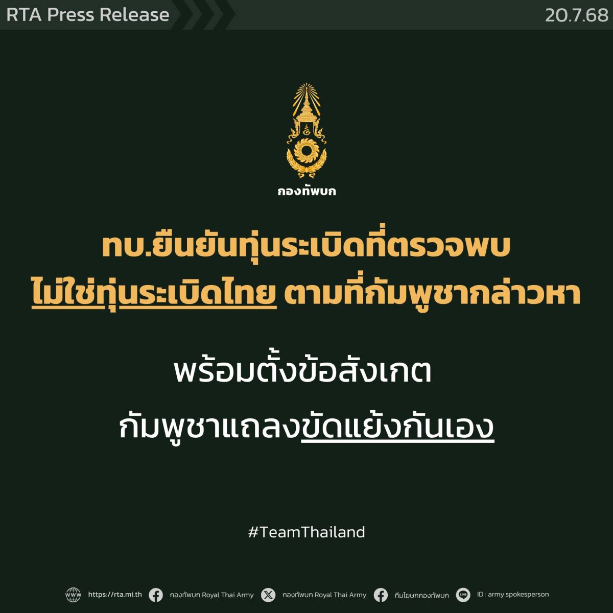 โฆษก ทบ. ชี้แจงกรณีฝ่ายกัมพูชากล่าวหาว่าทหารไทยเป็นผู้ฝังทุ่นระเบิด ยืนยันทุ่นระเบิดที่พบไม่ใช่ของไทย ข้อมูลจากฝ่ายกัมพูชาเป็นการบิดเบือนข้อเท็จจริง