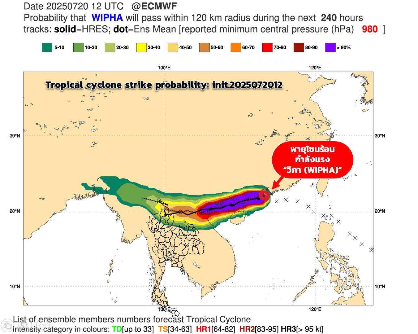 กรมอุตุนิยมวิทยา อัปเดตสถานการณ์และเส้นทางพายุโซนร้อนกำลังแรง "วิภา(WIPHA)" เช้าวันนี้ 21 กรกฎาคม 2568 เช้าวันนี้มีศูนย์กลางอยู่บริเวณเมืองจ้านเจียง มณฑลกวางตุ้ง ประเทศจีน กำลังเคลื่อนตัวทางตะวันตก (พายุนี้เคลื่อนตัวเร็ว) คาดว่าจะเคลื่อนตัวตามแนวชายฝั่งประเทศจีน เข้าสู่อ่าวตังเกี๋ย คาดว่าจะขึ้นฝั่งบริเวณประเทศเวียดนามเวียดตอนบนในเช้าวันพรุ่งนี้ 22 กรกฎาคม 2568 และจะอ่อนกำลังลงตามลำดับ