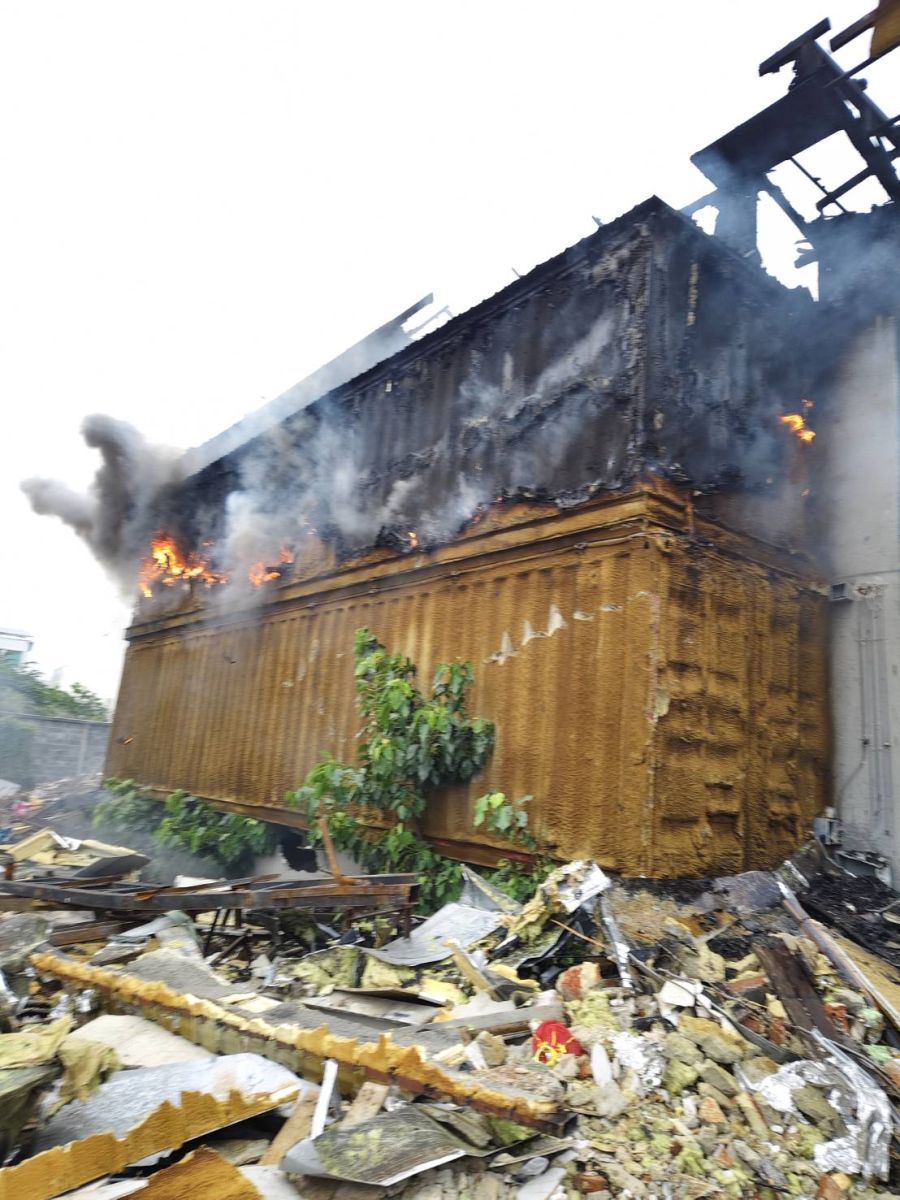 เวลา 12.12 น. ขณะนี้เพลิงสงบ ลักษณะที่เกิดเหตุเป็นตู้คอนเทนเนอร์ อยู่ระหว่างการรื้อถอน รายละเอียดเพิ่มเติมอยู่ระหว่างการตรวจสอบ