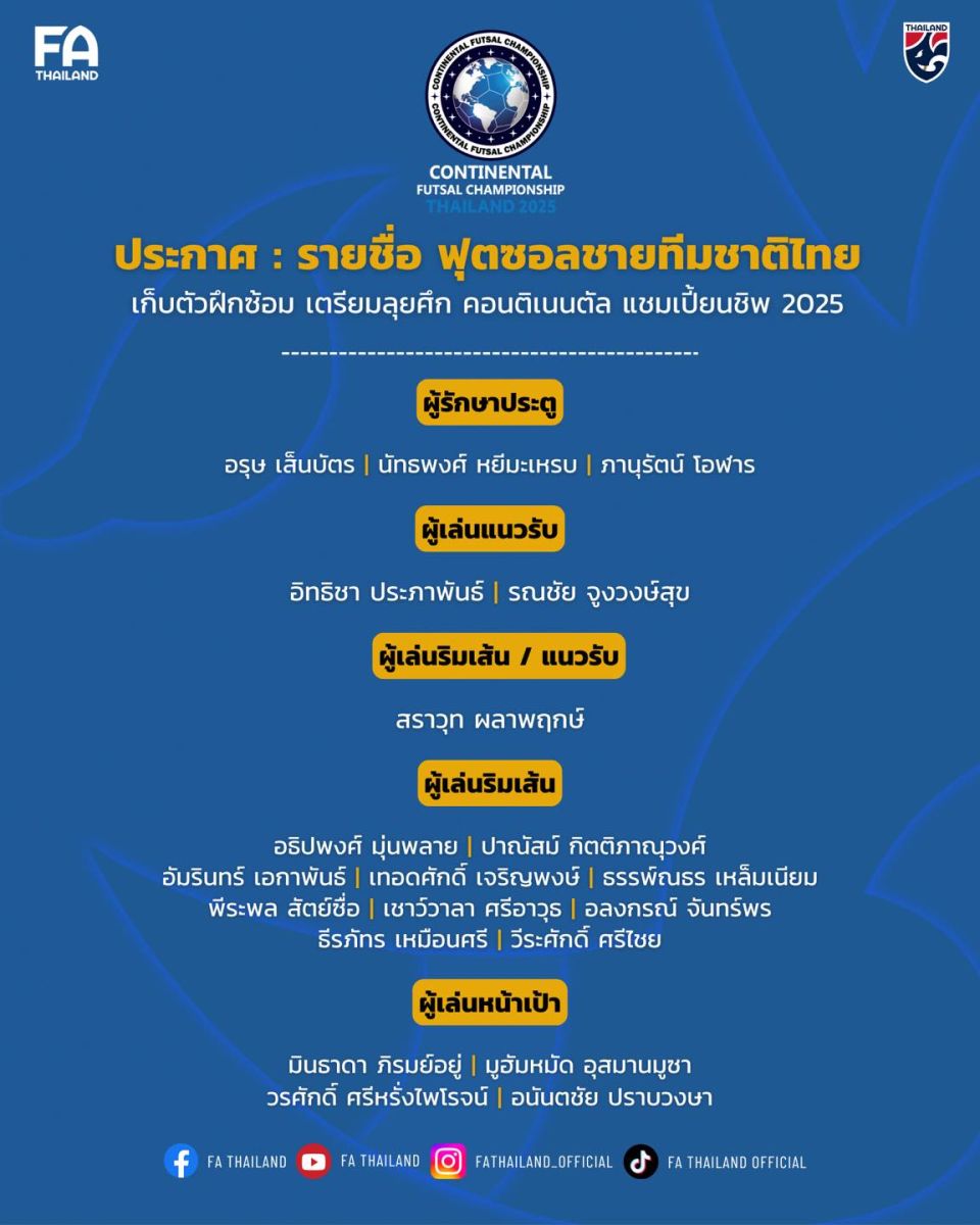 ประกาศ : รายชื่อ 20 แข้ง ฟุตซอลชายทีมชาติไทย เก็บตัวฝึกซ้อม เตรียมลุยศึก คอนติเนนตัล แชมเปี้ยนชิพ 2025