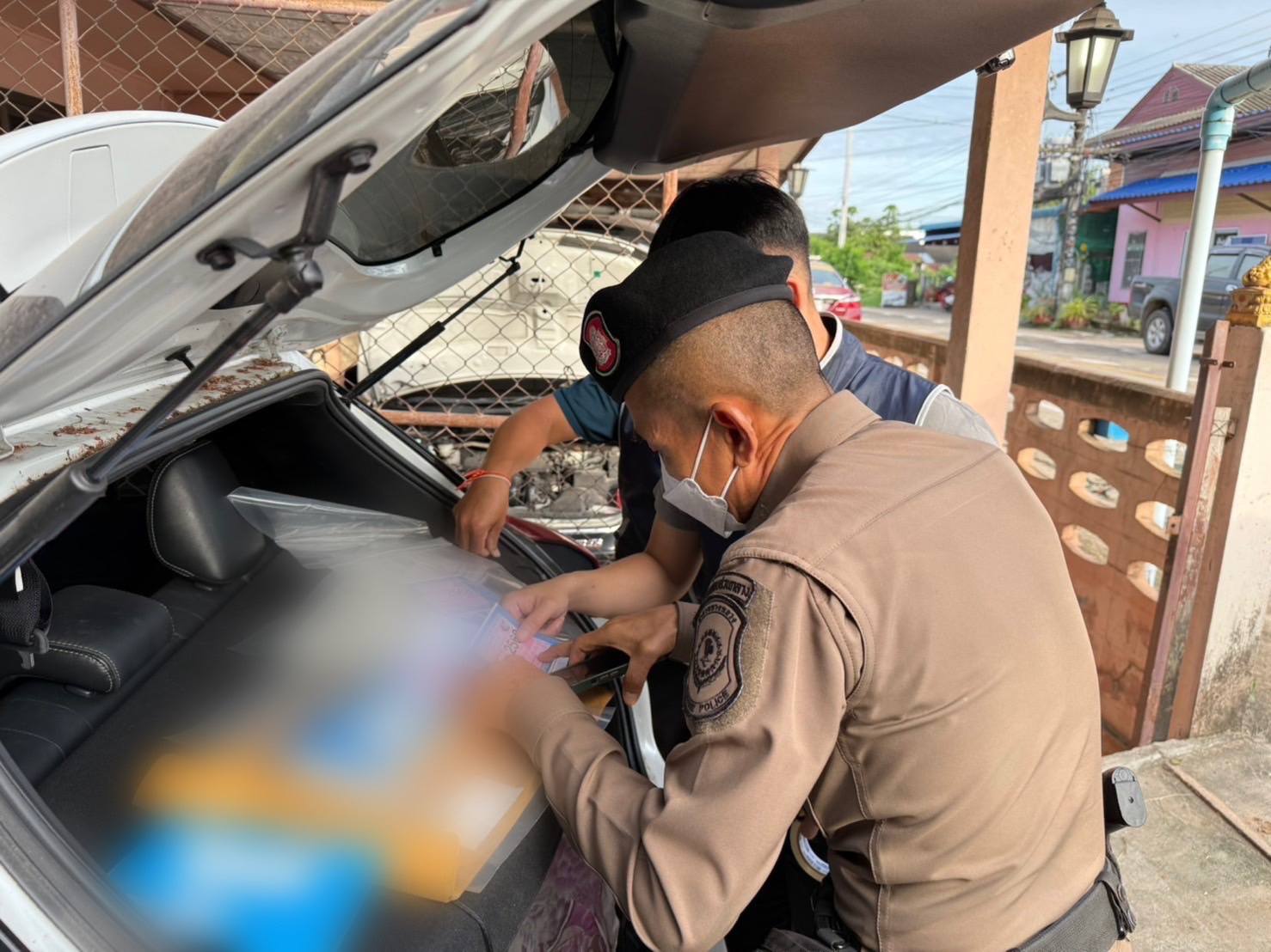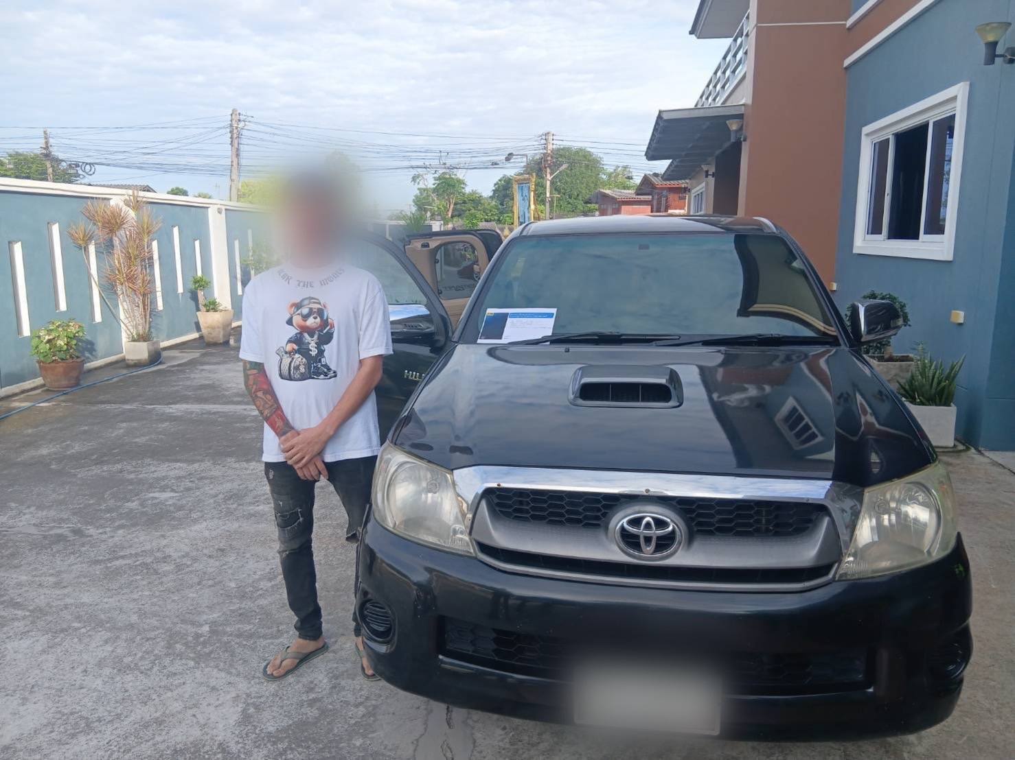 จากการล่อซื้อแผ่นป้ายแสดงการเสียภาษีประจำปีปลอมผ่านเพจเฟซบุ๊กที่ใช้ชื่อว่า “เฮียอ๊อด” โดยสายลับได้ติดต่อขอซื้อและชำระเงินค่าดำเนินการจำนวน 2,500 บาท ทางเพจยืนยันว่าจะจัดส่งเอกสารภายใน 1 สัปดาห์ ภายหลังเมื่อได้รับพัสดุและทำการตรวจสอบ พบว่าชื่อผู้จัดส่งพัสดุและบุคคลที่นำส่งตรงกับข้อมูลของผู้ต้องหา ซึ่งมีประวัติอาชญากรรมเกี่ยวกับการปลอมแปลงเอกสารและยาเสพติด และเมื่อนำแผ่นป้ายภาษีไปตรวจสอบกับกรมการขนส่งทางบก ก็ได้รับการยืนยันว่าเป็น "เอกสารปลอม" เนื่องจากหมายเลขคุมภาษีดังกล่าวไม่เคยถูกผลิตขึ้นจริง