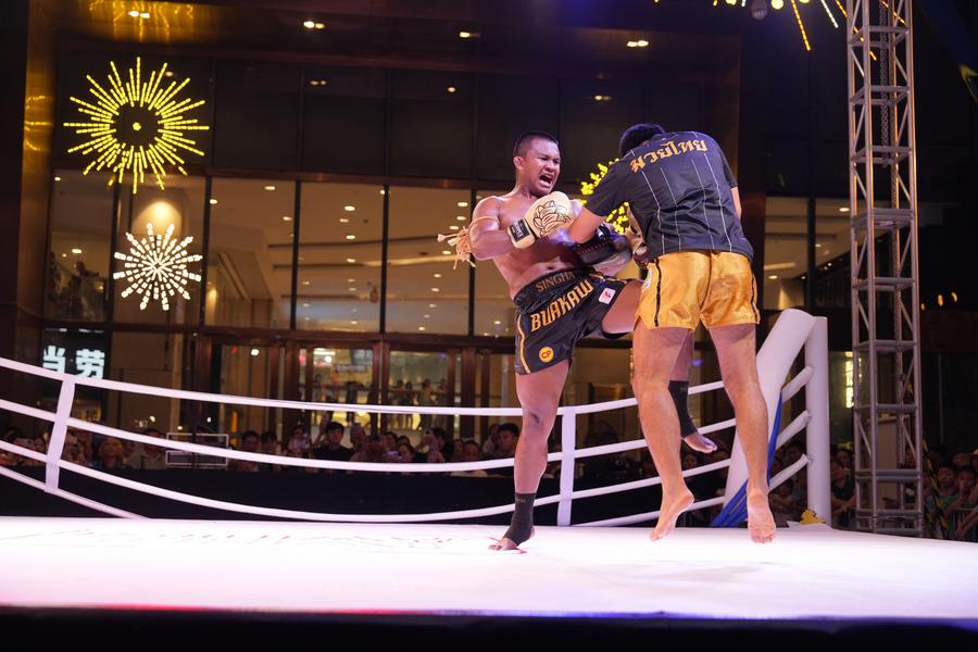 (ภาพจากผู้ให้สัมภาษณ์ : บัวขาว บัญชาเมฆ (ขวา) นักมวยไทยชื่อดัง ทำการแสดงมวยไทยบนเวทีหน้าห้างสรรพสินค้าใกล้ศูนย์การประชุมและนิทรรศการนานาชาติหนานหนิง เมืองหนานหนิง เขตปกครองตนเองกว่างซีจ้วงทางตอนใต้ของจีน)