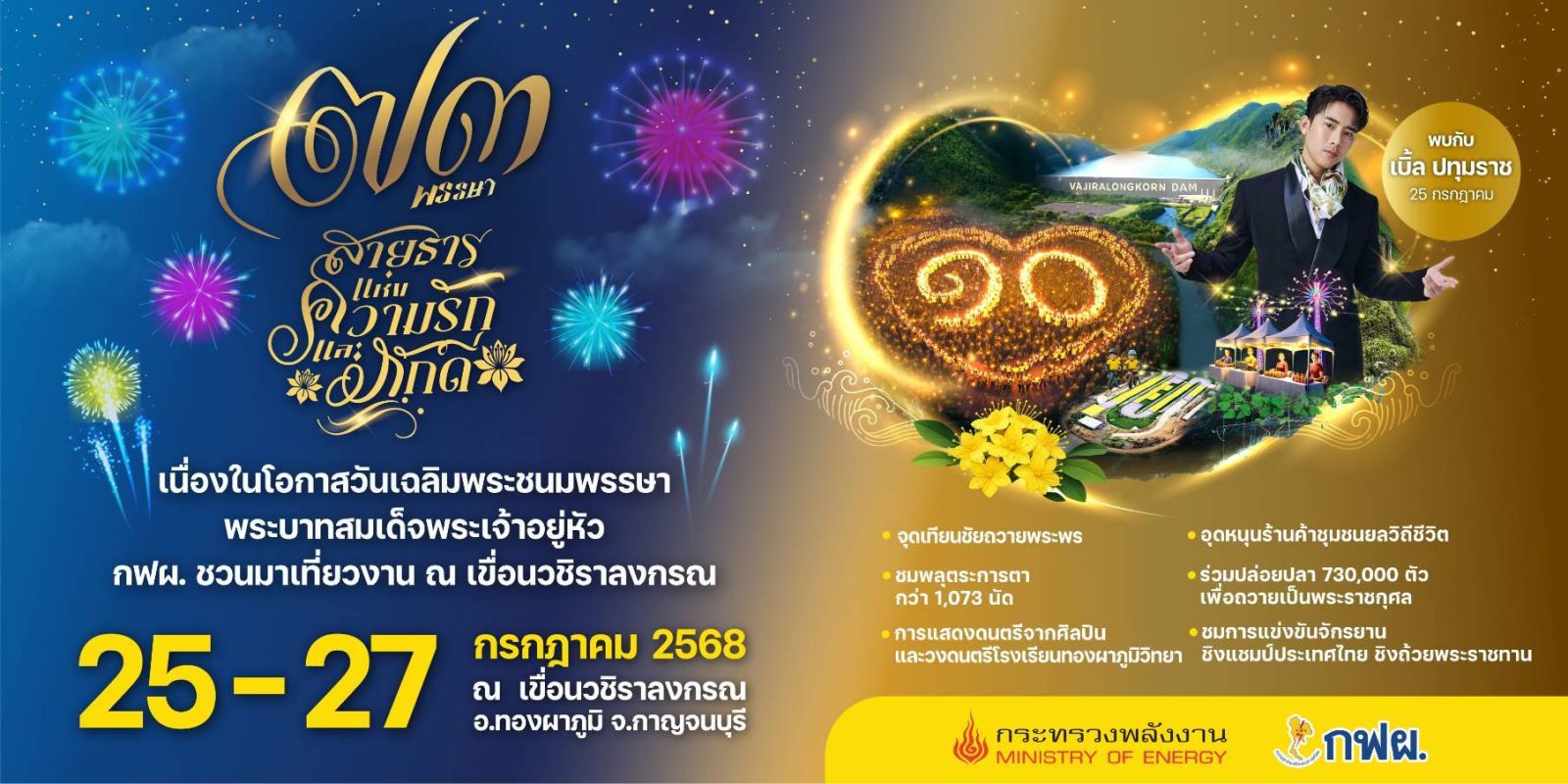 การไฟฟ้าฝ่ายผลิตแห่งประเทศไทย (กฟผ.) ขอเชิญชวนร่วมกิจกรรมเฉลิมพระเกียรติพระบาทสมเด็จพระเจ้าอยู่หัว เนื่องในโอกาสวันเฉลิมพระชนมพรรษา 28 กรกฎาคม 2568 “73 พรรษา สายธารแห่งความรักและภักดี” ระหว่างวันที่ 25-27 กรกฎาคม 2568 ณ เขื่อนวชิราลงกรณ อ.ทองผาภูมิ จ.กาญจนบุรี พบกับพิธีจุดเทียนชัยถวายพระพร การแสดงแสงสีเสียง และชมพลุตระการตากว่า 1,073 นัด การจำหน่ายสินค้าชุมชน มินิคอนเสิร์ตจากศิลปินลูกทุ่งชื่อดัง เบิ้ล ปทุมราช และวงดนตรีโรงเรียนทองผาภูมิวิทยา ชมการแข่งขันจักรยาน ชิงแชมป์ประเทศไทย และกิจกรรมปล่อยปลา 730,000 ตัว ถวายเป็นพระราชกุศลแด่พระบาทสมเด็จพระเจ้าอยู่หัว