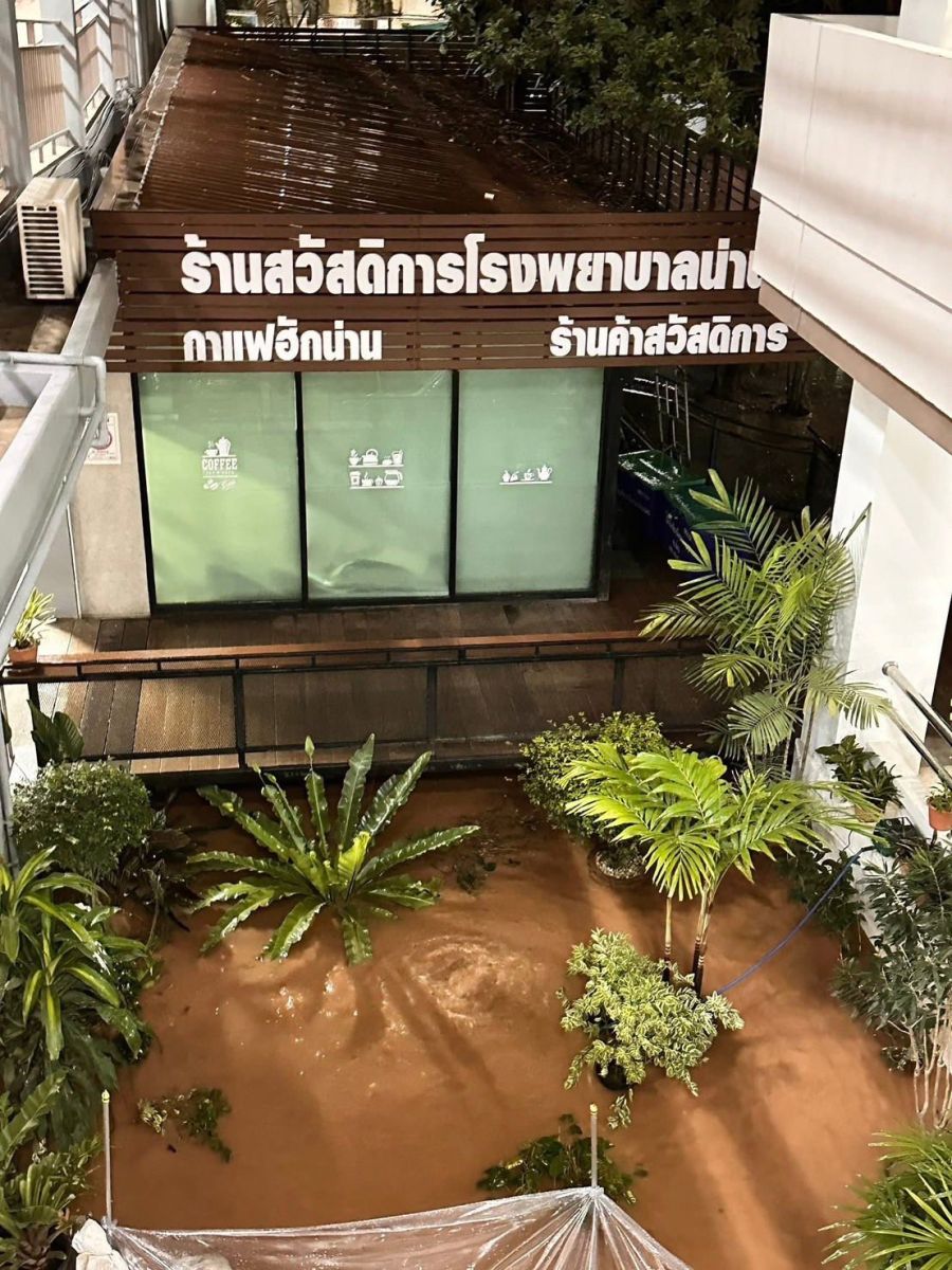 พนังกั้นล้ม น้ำไหลทะลักเข้า รพ.น่าน เคลื่อนย้ายผู้ป่วย ไปฝูงบินอิสระปฏิบัติราชการสนาม ๔๖๖ (น่าน) กองทัพอากาศ