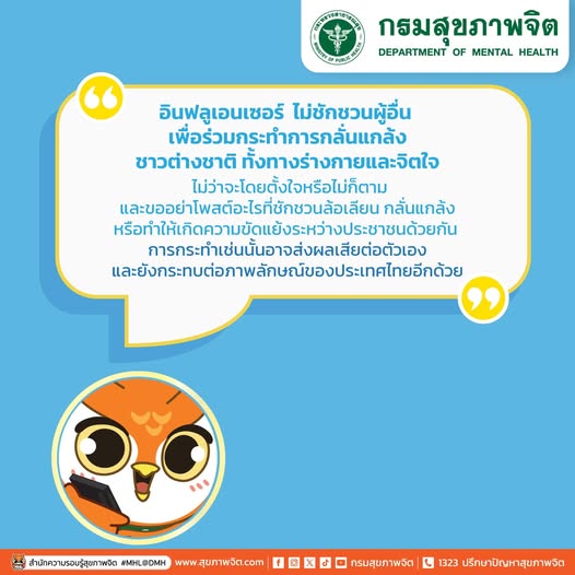 ล่าสุด กรมสุขภาพจิตขอความร่วมมือ เหล่า "อินฟลูเอนเซอร์" ไม่ชักชวนผู้อื่นเพื่อร่วมกระทำการกลั่นแกล้งชาวต่างชาติ ไม่ว่าจะทางร่างกาย หรือจิตใจ ไม่ว่าจะโดยตั้งใจหรือไม่ก็ตาม และ ขออย่าโพสต์อะไรที่ชักชวนล้อเลียน กลั่นแกล้ง หรือทำให้เกิดความขัดแย้งระหว่างประชาชนด้วยกัน การกระทำเช่นนั้นอาจส่งผลเสียต่อตัวเอง และยังกระทบต่อภาพลักษณ์ของประเทศไทยอีกด้วย