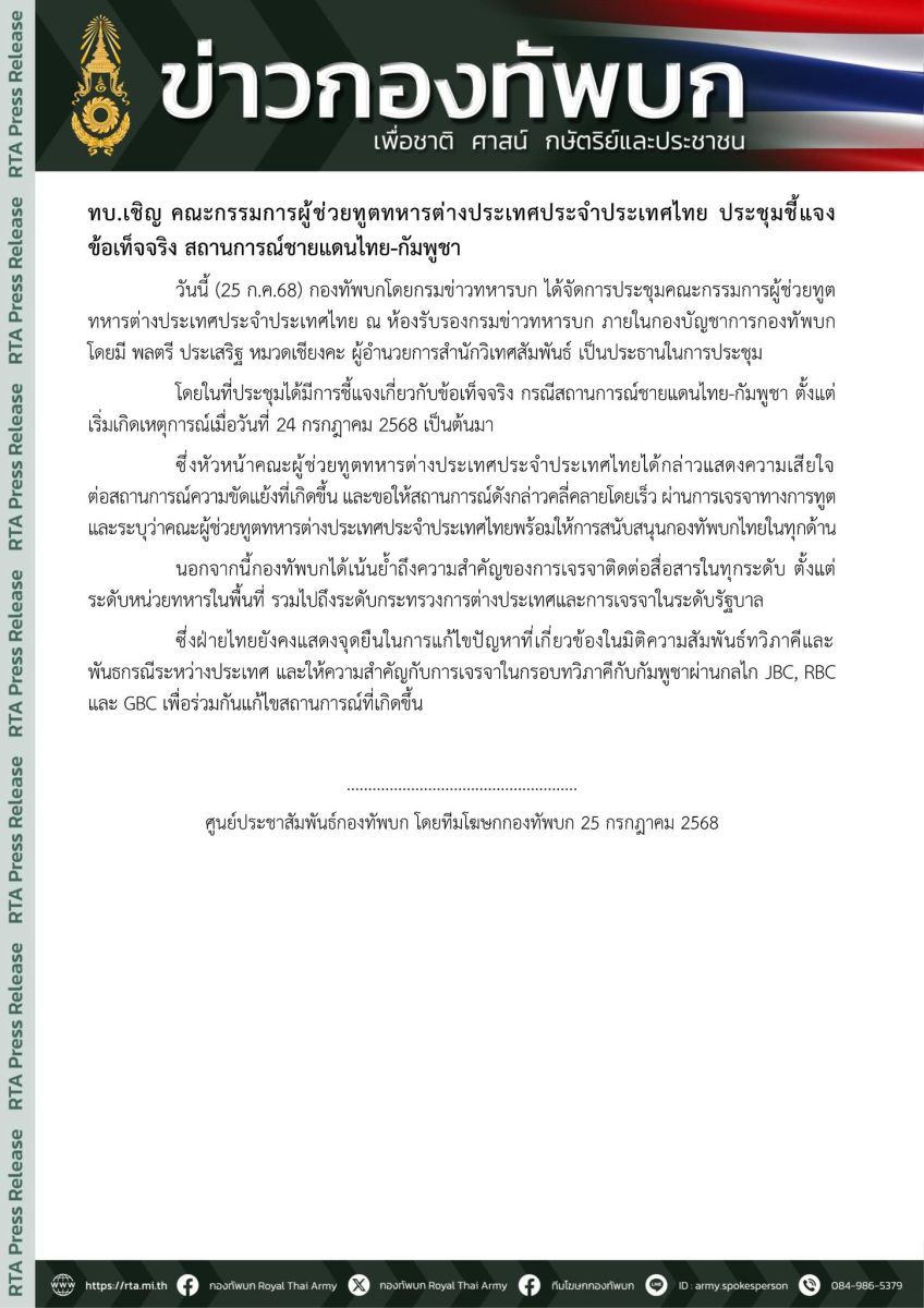 ซึ่งฝ่ายไทยยังคงแสดงจุดยืนในการแก้ไขปัญหาที่เกี่ยวข้องในมิติความสัมพันธ์ทวิภาคีและพันธกรณีระหว่างประเทศ และให้ความสำคัญกับการเจรจาในกรอบทวิภาคีกับกัมพูชาผ่านกลไก JBC, RBC และ GBC เพื่อร่วมกันแก้ไขสถานการณ์ที่เกิดขึ้น