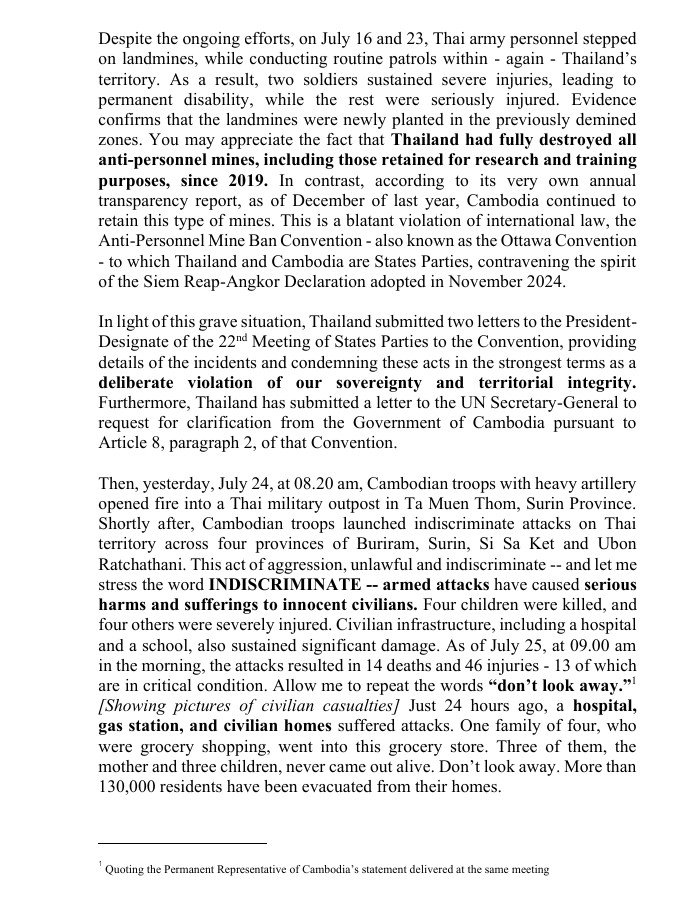 จากนั้น เมื่อวันที่ 24 กรกฎาคม เวลา 08.20 น. กองกำลังกัมพูชาได้เปิดฉากยิงปืนใหญ่หนักเข้าใส่ฐานทัพไทยที่ตำบลตาโมกข์ ตม. สุรินทร์ หลังจากนั้นไม่นาน กองกำลังกัมพูชาก็เปิดฉากโจมตีพลเรือนอย่างไม่เลือกหน้าในพื้นที่ชายแดนไทยสี่จังหวัด ได้แก่ บุรีรัมย์, สุรินทร์, ศรีสะเกษ และอุบลราชธานี การกระทำที่เลือกปฏิบัติ ผิดกฎหมาย และไร้มนุษยธรรมนี้ – และขอให้ผมเน้นย้ำคำว่า การเลือกปฏิบัติ – การโจมตีด้วยอาวุธทำให้เกิด อันตรายร้ายแรงและความทุกข์ทรมานต่อพลเรือน มีพลเรือนสี่รายเสียชีวิต และอีกสี่รายได้รับบาดเจ็บสาหัส โครงสร้างพื้นฐานของพลเรือน รวมถึงโรงพยาบาลและโรงเรียน ก็ได้รับความเสียหายอย่างหนัก